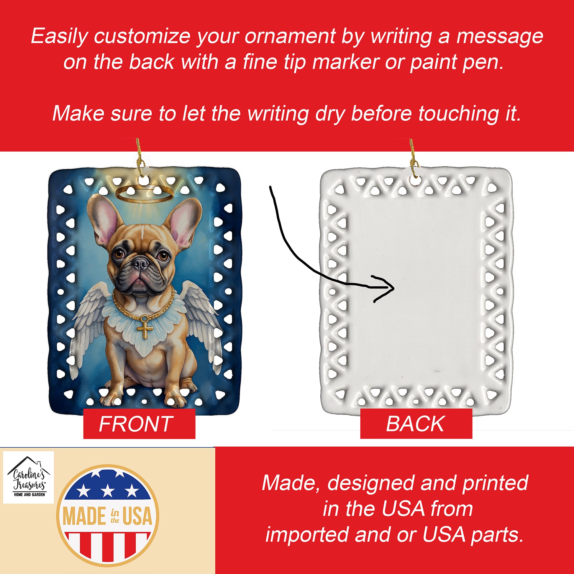 Porcelain Ornament featuring breed specific French Bulldog artwork. Celebrate Christmas with this Christmas Ornament. Add a unique, personal touch to your holiday decor with our Rectangular Lattice Porcelain Ornament. Perfect for creating cherished memories, this high-quality ornament shines under festive lights, reflecting warmth and joy throughout your Christmas tree. Crafted with a glossy finish, it showcases vibrant, full-color artwork contributed by our talented artists, ensuring your tree is adorned with a burst of color and holiday spirit. What sets this Porcelain Ornament apart is its customizable white back. Use a paint pen or permanent marker to write a heartfelt message, commemorate a special year, or mark an unforgettable date, turning this ornament into a keepsake that will be treasured for years to come. For best results, allow any personalization to dry thoroughly before handling. Each ornament comes complete with a delicate gold cord, making it easy to hang and display. Proudly made in the USA, this ornament measures 3.375 x 2.625 inches and is a thoughtful gift for pet sitters, teachers, family members, or anyone who would appreciate a little extra holiday magic. Bring style, charm, and a touch of personal meaning to your Christmas tree with this beautifully designed ornament..