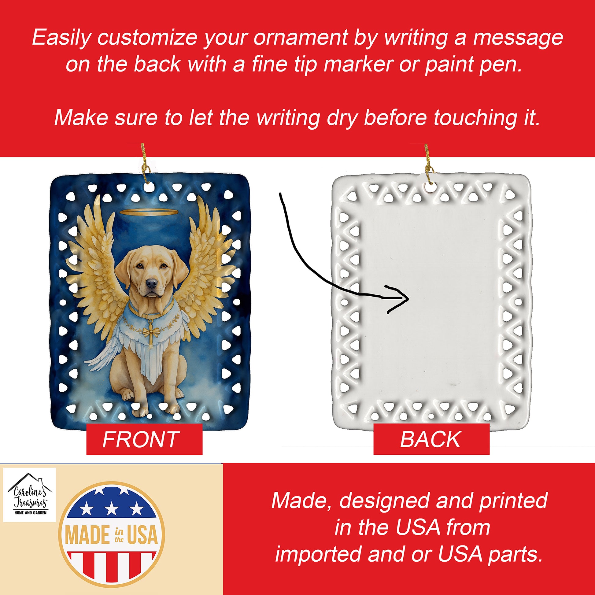 Porcelain Ornament featuring breed specific Labrador Retriever artwork. Celebrate Christmas with this Christmas Ornament. Add a unique, personal touch to your holiday decor with our Rectangular Lattice Porcelain Ornament. Perfect for creating cherished memories, this high-quality ornament shines under festive lights, reflecting warmth and joy throughout your Christmas tree. Crafted with a glossy finish, it showcases vibrant, full-color artwork contributed by our talented artists, ensuring your tree is adorned with a burst of color and holiday spirit. What sets this Porcelain Ornament apart is its customizable white back. Use a paint pen or permanent marker to write a heartfelt message, commemorate a special year, or mark an unforgettable date, turning this ornament into a keepsake that will be treasured for years to come. For best results, allow any personalization to dry thoroughly before handling. Each ornament comes complete with a delicate gold cord, making it easy to hang and display. Proudly made in the USA, this ornament measures 3.375 x 2.625 inches and is a thoughtful gift for pet sitters, teachers, family members, or anyone who would appreciate a little extra holiday magic. Bring style, charm, and a touch of personal meaning to your Christmas tree with this beautifully designed ornament..