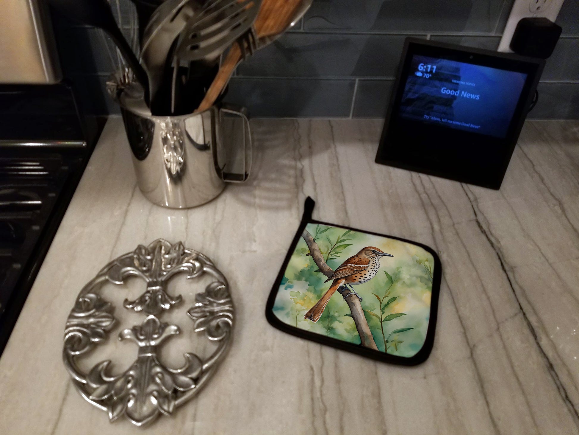 Pair of Pot Holders featuring breed specific Brown Thrasher artwork. A Pair of Pot Holders to match your kitchen decor. Made in the USA these are thick and functional. Full color artwork decorates the front polyester fabric of the hot pad and accented by a black trim. Use these at as a trivet for your Thanksgiving or Christmas tablescape. Filled with insulated fabric and quilted for durability. These colorful pot holders will make a great gift for your favorite home cook or executive chef. Each pot holder measures approximately 7 1/2 inches by 7 1/2 inches. A hanging tab is included.
