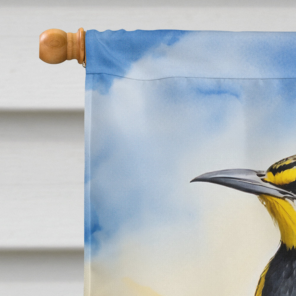 House Flag featuring breed specific Western Meadowlark artwork. Presenting our Heavy Duty Polyester House Size Decorative Sleeve Pole Flag, a vibrant addition to enhance the aesthetic appeal of your home. This large decorative flag, measuring approximately 28 x 40 inches, offers ample coverage and visibility. Each flag is meticulously sewn and made individually, ensuring a unique piece that may slightly vary in size. It's a sleeve pole flag, designed to fit a standard decorative flag pole effortlessly. Please note that the flag pole and bracket are not included and should be purchased separately. What sets our flag apart is its dual-sided print. The design is mirrored on both sides of the fabric, allowing for uniform visibility regardless of the angle. Printed in full color, our flag showcases vibrant hues that truly stand out. To ensure lasting vibrancy and durability, the dyes are heat-set into the fabric. This ensures your flag remains bright and captivating through various weather conditions. Elevate the look of your home with our Heavy Duty Polyester House Size Decorative Sleeve Pole Flag!