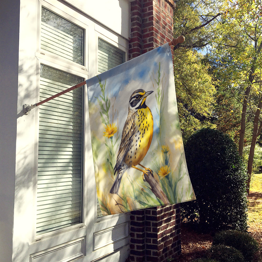 House Flag featuring breed specific Western Meadowlark artwork. Presenting our Heavy Duty Polyester House Size Decorative Sleeve Pole Flag, a vibrant addition to enhance the aesthetic appeal of your home. This large decorative flag, measuring approximately 28 x 40 inches, offers ample coverage and visibility. Each flag is meticulously sewn and made individually, ensuring a unique piece that may slightly vary in size. It's a sleeve pole flag, designed to fit a standard decorative flag pole effortlessly. Please note that the flag pole and bracket are not included and should be purchased separately. What sets our flag apart is its dual-sided print. The design is mirrored on both sides of the fabric, allowing for uniform visibility regardless of the angle. Printed in full color, our flag showcases vibrant hues that truly stand out. To ensure lasting vibrancy and durability, the dyes are heat-set into the fabric. This ensures your flag remains bright and captivating through various weather conditions. Elevate the look of your home with our Heavy Duty Polyester House Size Decorative Sleeve Pole Flag!