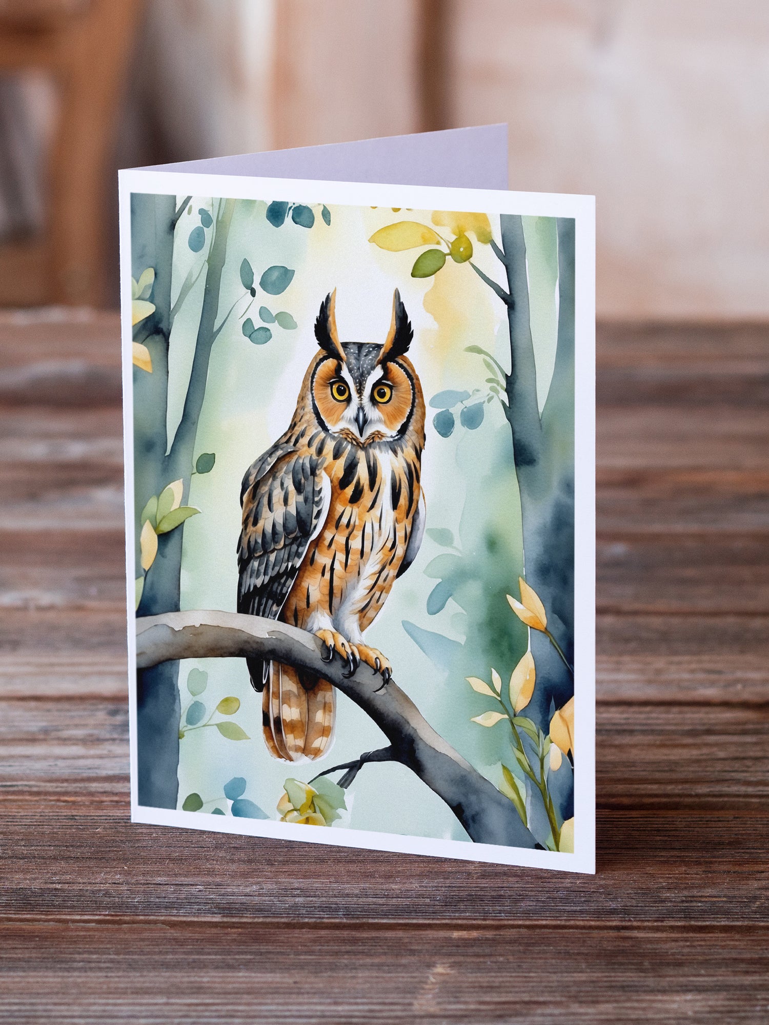 Greeting Cards Pack of 8 featuring breed specific LongEared Owl artwork. Celebrate special moments with Caroline's Treasures Printed Greeting Card Pack. This pack includes eight beautifully folded 5x7 cards, accompanied by eight matching white envelopes. With blank interiors, these cards provide ample space for your personalized messages and heartfelt holiday greetings. Each card features captivating full-color artwork, meticulously printed in our facility on high-quality 80 lb cover stock or 216 GSM. The super smooth finish of the white cards enhances the visual impact of the artwork, creating a truly stunning presentation. Designed by our talented in-house artists or licensed artists, the artwork on these cards showcases their creativity and attention to detail. From vibrant illustrations to captivating designs, each card tells its own unique story. Whether it's for birthdays, anniversaries, holidays, or any special occasion, Caroline's Treasures Greeting Card Pack is the perfect way to convey your heartfelt sentiments. Share joy, love, and warm wishes with these exquisite cards and make every moment unforgettable.