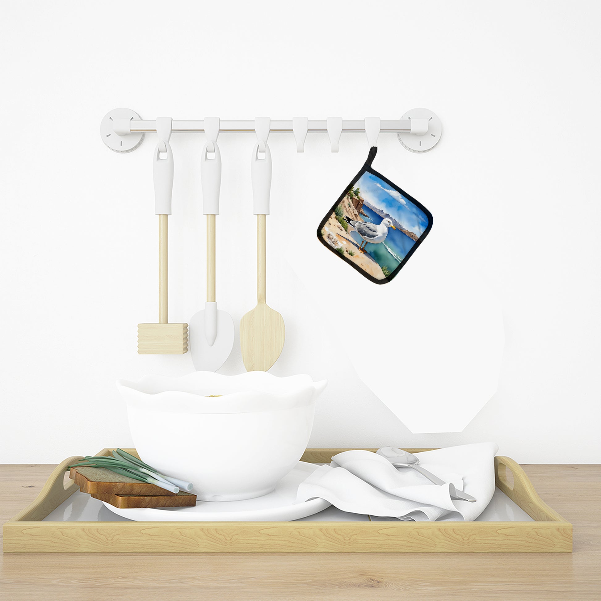 Pair of Pot Holders featuring breed specific California Gull artwork. A Pair of Pot Holders to match your kitchen decor. Made in the USA these are thick and functional. Full color artwork decorates the front polyester fabric of the hot pad and accented by a black trim. Use these at as a trivet for your Thanksgiving or Christmas tablescape. Filled with insulated fabric and quilted for durability. These colorful pot holders will make a great gift for your favorite home cook or executive chef. Each pot holder measures approximately 7 1/2 inches by 7 1/2 inches. A hanging tab is included.