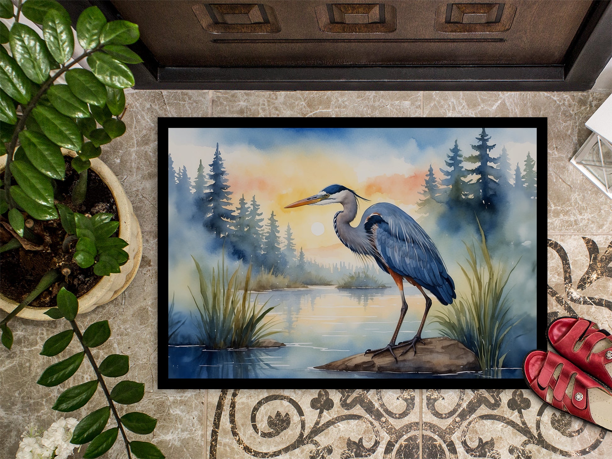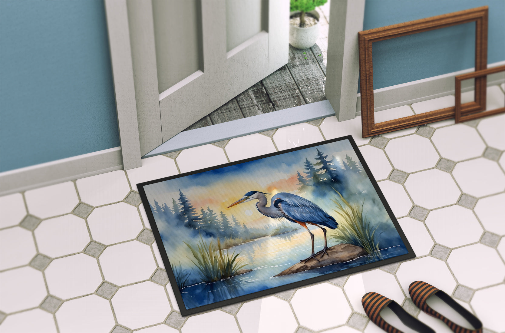 Doormat featuring breed specific Blue Heron artwork. Welcome your guests in style with our Artwork Door Mat, designed to withstand almost any weather condition. This mat, measuring approximately 24 by 36 inches, is held together by durable black binding tape. Its top layer, composed of polyester felt, is dyed with the eye-catching image you see on the mat. A few layers below provide the mat with stability, while its rubber bottom is stamped to help prevent slipping and ensures safety. Our mat works wonderfully as both an indoor or outdoor door mat. For cleaning, simply hose it off with water or use a power washer - no need for any cleaner that produces suds. Avoid scrubbing with a brush, instead, opt for the vacuum on floor setting. Designed manufactured and printed in the USA, this mat is a perfect addition to your porch, outdoor kitchen, entryway, or any indoor space. Its unique design makes it a charming decorative rug that greets your guests and adds a stylish touch to your home decor.