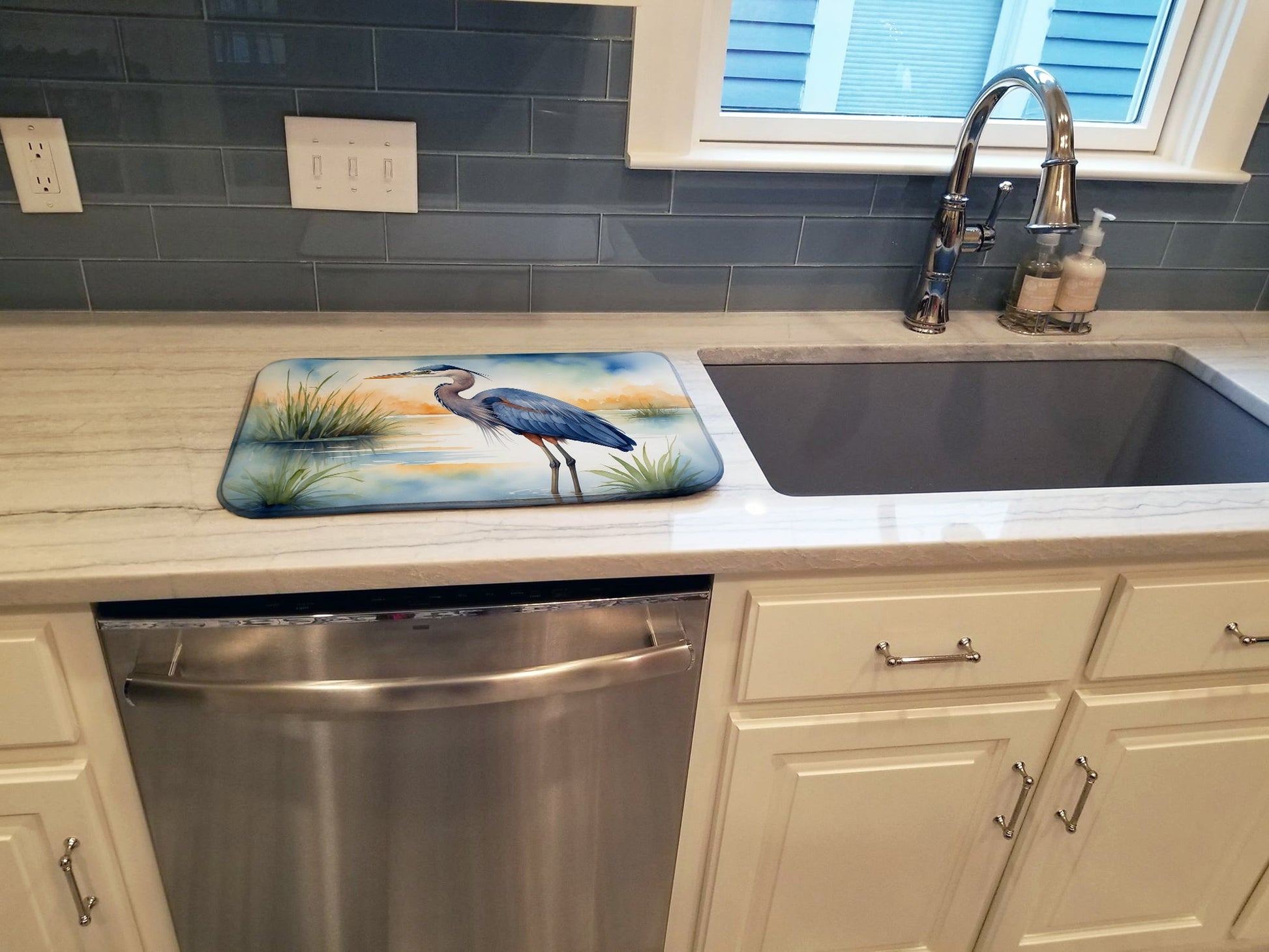 Dish Drying Mat featuring breed specific Blue Heron artwork. Say goodbye to messy countertops and soggy dish towels with our innovative dish drying mat. Our high-quality dish drying pad is designed to keep your countertops dry while offering a stylish and efficient solution. Whether you're air drying dishes, glasses, stemware, silverware, pots, pans, bottles, or even fruits and vegetables, our dish mat is the perfect choice. The 14 inches x 22 inches size fits most counters and dish drying racks, and the non-slip design ensures stability. Made with water-absorbent polyester and a polyurethane foam insert, our dish drying mat is not only functional but also durable. It's machine washable and printed in the USA for long-lasting use. The beautiful artwork adds flair to your kitchen decor, making it a perfect housewarming gift or present for any occasion. Upgrade your kitchen experience with our absorbent and versatile dish drying mat.