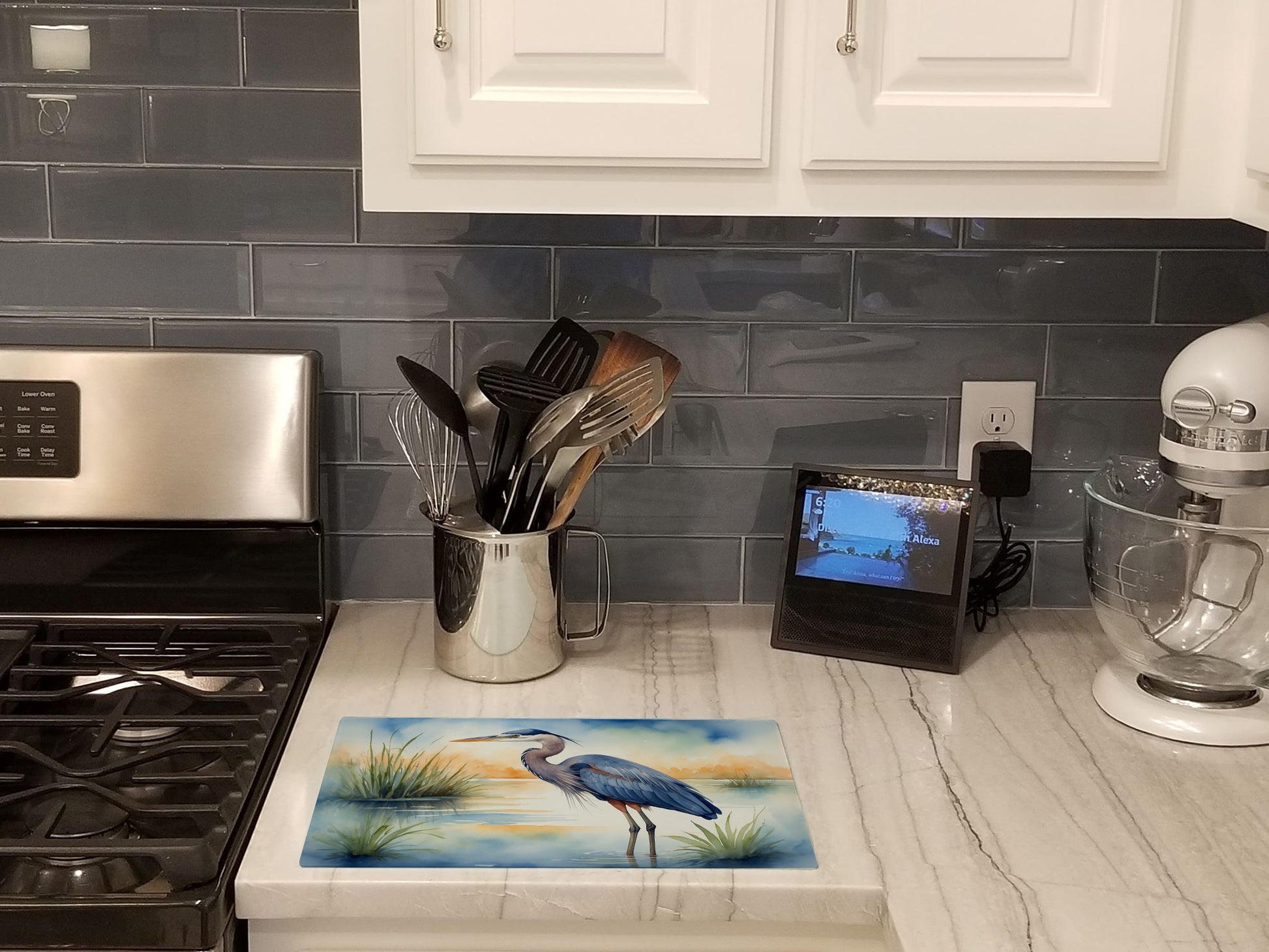 Glass Cutting Board featuring breed specific Blue Heron artwork. Introduce your kitchen to the vibrant, large Decorative Glass Cutting Board from Caroline's Treasures. Crafted from resilient tempered glass, this board is not only a utilitarian necessity but also a colorful art piece. With its generous dimensions of 15 inches in height and 12 inches in length, it offers ample space for all your cutting needs. Every piece showcases captivating artwork from distinguished artists, bringing an aesthetic edge to your kitchen. Beyond its attractive design, this cutting board ensures your countertop stays pristine and unscathed, owing to its heat-resistant properties. Engineered with user convenience in mind, it features non-skid feet for stability, and rounded corners for additional safety. Its robust construction renders it virtually unbreakable, guaranteeing longevity. The board comes with protective feet bumpers, maintaining its position during use. This product is recommended to be hand washed only. Proudly printed and assembled in the United States, this cutting board exemplifies superior craftsmanship. With Caroline's Treasures' Decorative Glass Cutting Board, you're investing in a blend of functionality and artistic flair.