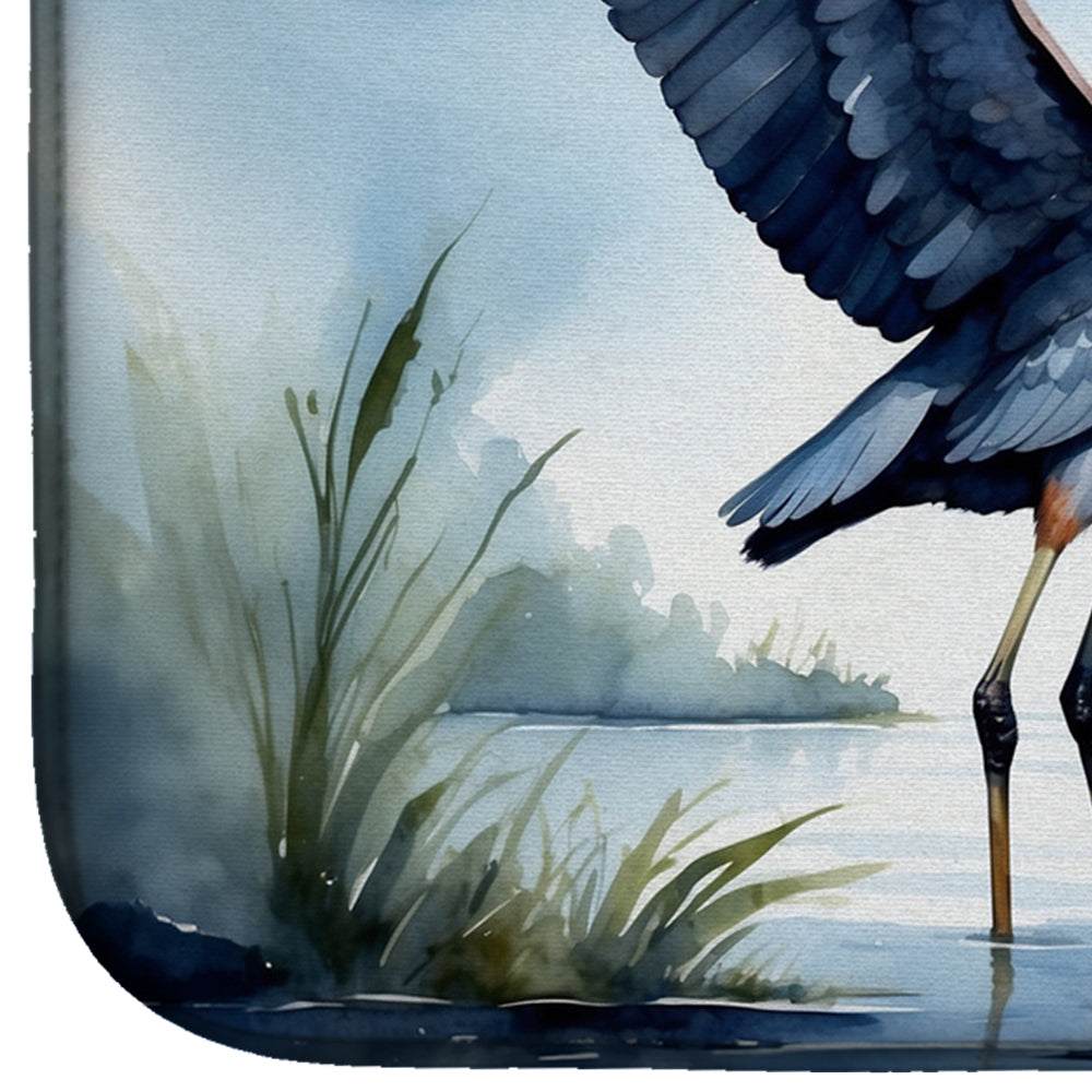 Dish Drying Mat featuring breed specific Blue Heron artwork. Say goodbye to messy countertops and soggy dish towels with our innovative dish drying mat. Our high-quality dish drying pad is designed to keep your countertops dry while offering a stylish and efficient solution. Whether you're air drying dishes, glasses, stemware, silverware, pots, pans, bottles, or even fruits and vegetables, our dish mat is the perfect choice. The 14 inches x 22 inches size fits most counters and dish drying racks, and the non-slip design ensures stability. Made with water-absorbent polyester and a polyurethane foam insert, our dish drying mat is not only functional but also durable. It's machine washable and printed in the USA for long-lasting use. The beautiful artwork adds flair to your kitchen decor, making it a perfect housewarming gift or present for any occasion. Upgrade your kitchen experience with our absorbent and versatile dish drying mat.