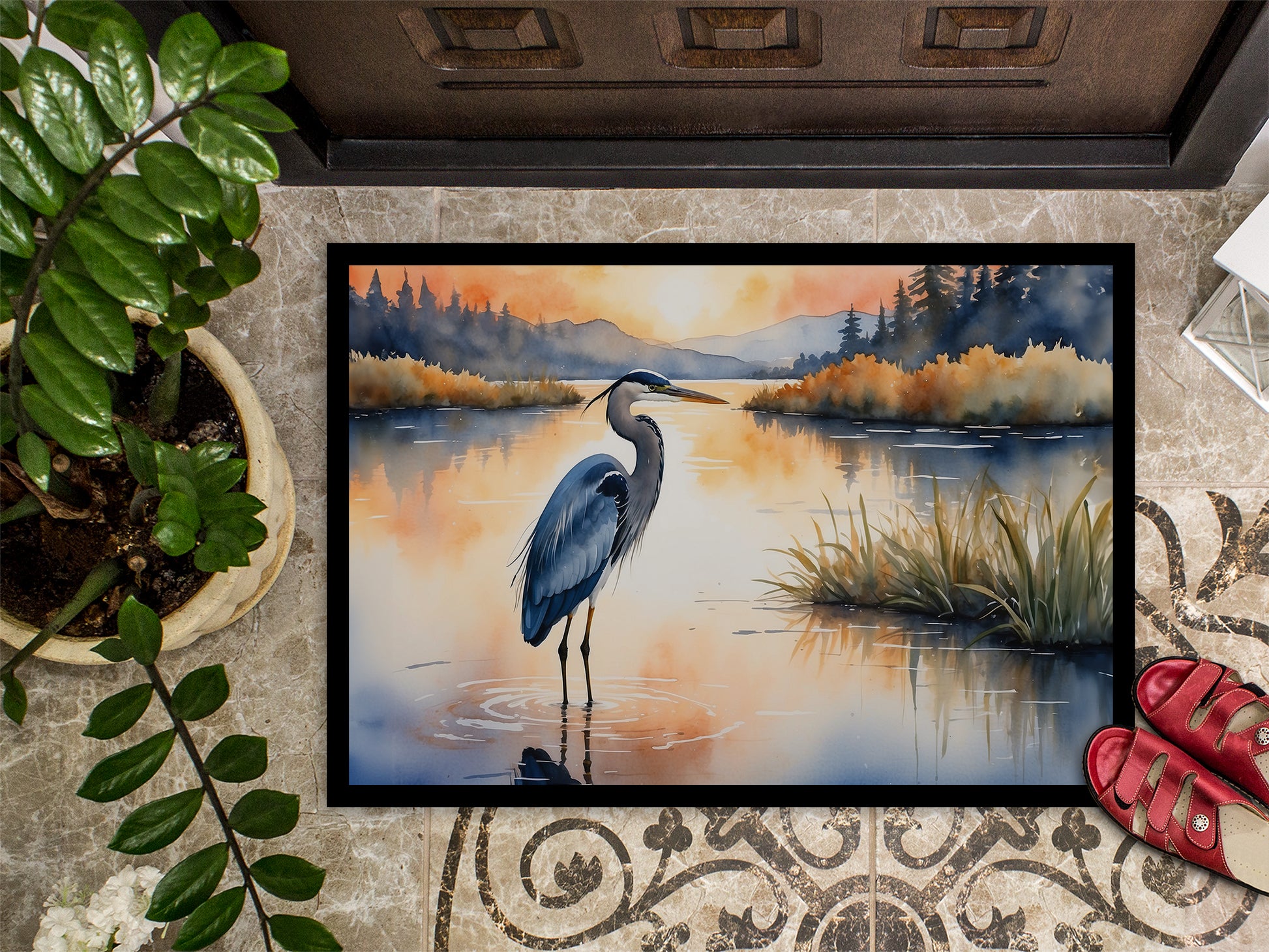 Doormat featuring breed specific Blue Heron artwork. Welcome your guests in style with our Artwork Door Mat, designed to withstand almost any weather condition. This mat, measuring approximately 24 by 36 inches, is held together by durable black binding tape. Its top layer, composed of polyester felt, is dyed with the eye-catching image you see on the mat. A few layers below provide the mat with stability, while its rubber bottom is stamped to help prevent slipping and ensures safety. Our mat works wonderfully as both an indoor or outdoor door mat. For cleaning, simply hose it off with water or use a power washer - no need for any cleaner that produces suds. Avoid scrubbing with a brush, instead, opt for the vacuum on floor setting. Designed manufactured and printed in the USA, this mat is a perfect addition to your porch, outdoor kitchen, entryway, or any indoor space. Its unique design makes it a charming decorative rug that greets your guests and adds a stylish touch to your home decor.