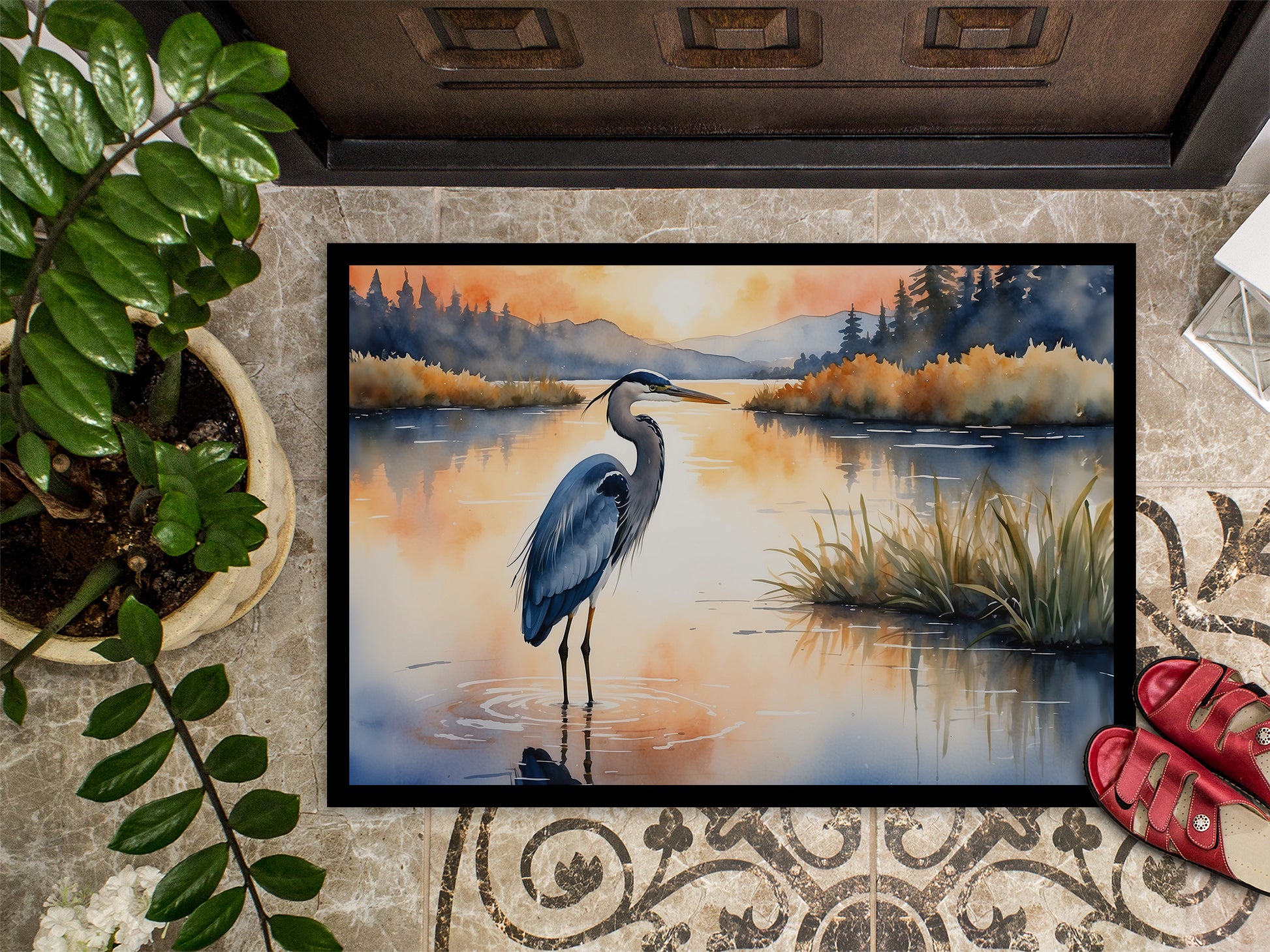 Doormat featuring breed specific Blue Heron artwork. Welcome your guests in style with our Artwork Door Mat, designed to withstand almost any weather condition. This mat, measuring approximately 18 by 27 inches, is held together by durable black binding tape. Its top layer, composed of polyester felt, is dyed with the eye-catching image you see on the mat. A few layers below provide the mat with stability, while its rubber bottom is stamped to help prevent slipping and ensures safety. Our mat works wonderfully as both an indoor or outdoor door mat. For cleaning, simply hose it off with water or use a power washer - no need for any cleaner that produces suds. Avoid scrubbing with a brush, instead, opt for the vacuum on floor setting. Designed manufactured and printed in the USA, this mat is a perfect addition to your porch, outdoor kitchen, entryway, or any indoor space. Its unique design makes it a charming decorative rug that greets your guests and adds a stylish touch to your home decor.