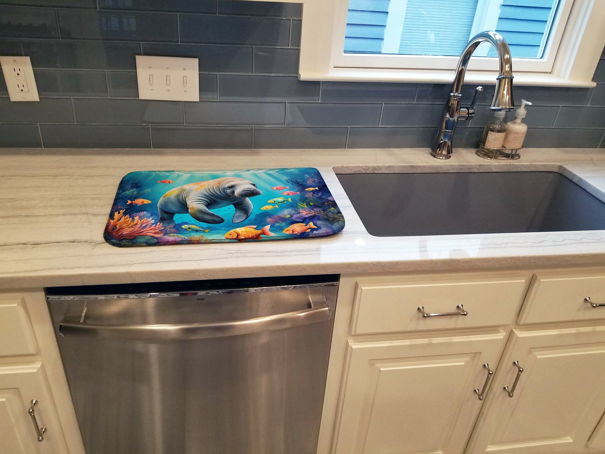Dish Drying Mat featuring breed specific Manatee artwork. Say goodbye to messy countertops and soggy dish towels with our innovative dish drying mat. Our high-quality dish drying pad is designed to keep your countertops dry while offering a stylish and efficient solution. Whether you're air drying dishes, glasses, stemware, silverware, pots, pans, bottles, or even fruits and vegetables, our dish mat is the perfect choice. The 14 inches x 22 inches size fits most counters and dish drying racks, and the non-slip design ensures stability. Made with water-absorbent polyester and a polyurethane foam insert, our dish drying mat is not only functional but also durable. It's machine washable and printed in the USA for long-lasting use. The beautiful artwork adds flair to your kitchen decor, making it a perfect housewarming gift or present for any occasion. Upgrade your kitchen experience with our absorbent and versatile dish drying mat.