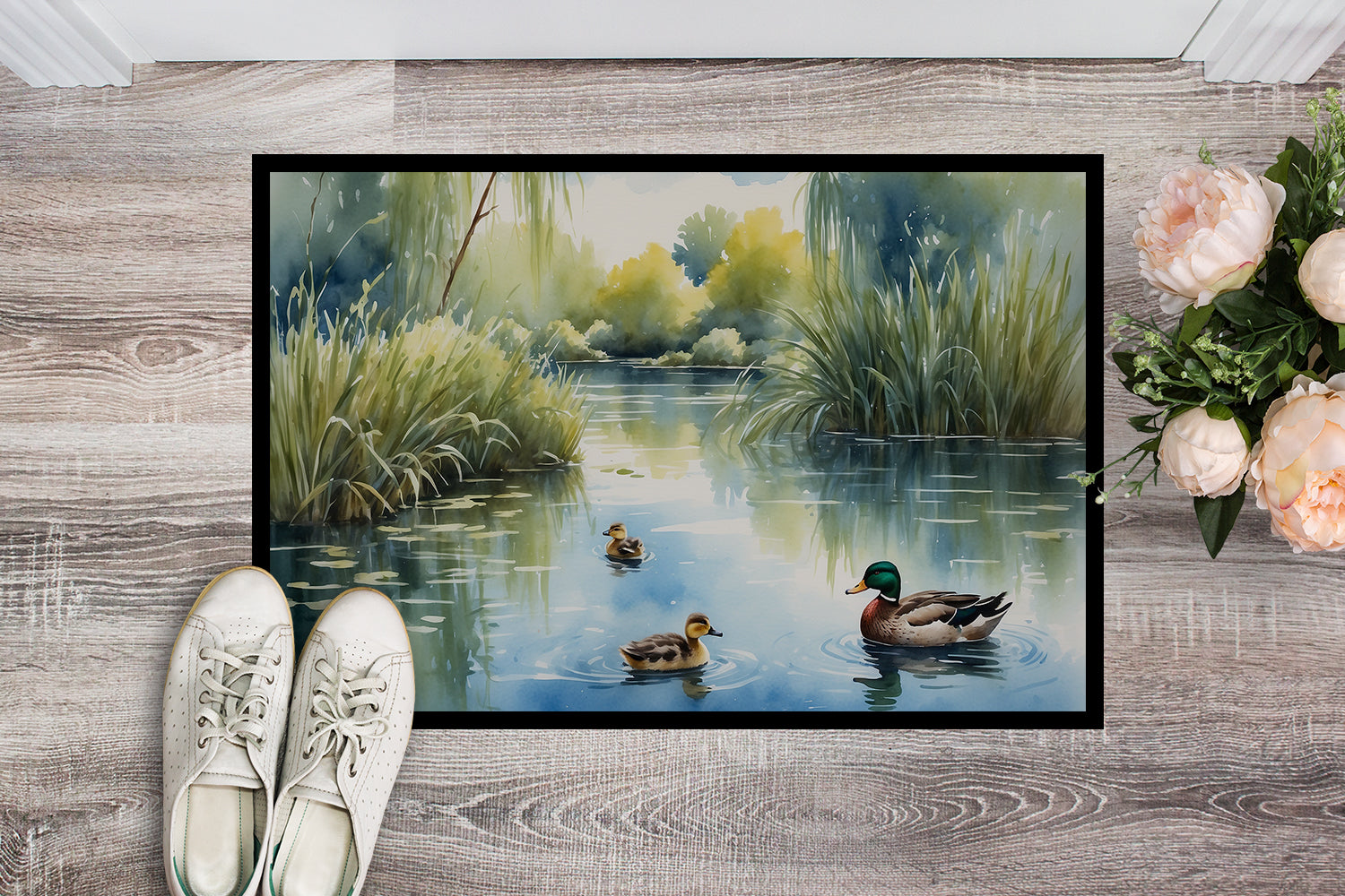 Doormat featuring breed specific Ducks artwork. Welcome your guests in style with our Artwork Door Mat, designed to withstand almost any weather condition. This mat, measuring approximately 24 by 36 inches, is held together by durable black binding tape. Its top layer, composed of polyester felt, is dyed with the eye-catching image you see on the mat. A few layers below provide the mat with stability, while its rubber bottom is stamped to help prevent slipping and ensures safety. Our mat works wonderfully as both an indoor or outdoor door mat. For cleaning, simply hose it off with water or use a power washer - no need for any cleaner that produces suds. Avoid scrubbing with a brush, instead, opt for the vacuum on floor setting. Designed manufactured and printed in the USA, this mat is a perfect addition to your porch, outdoor kitchen, entryway, or any indoor space. Its unique design makes it a charming decorative rug that greets your guests and adds a stylish touch to your home decor.