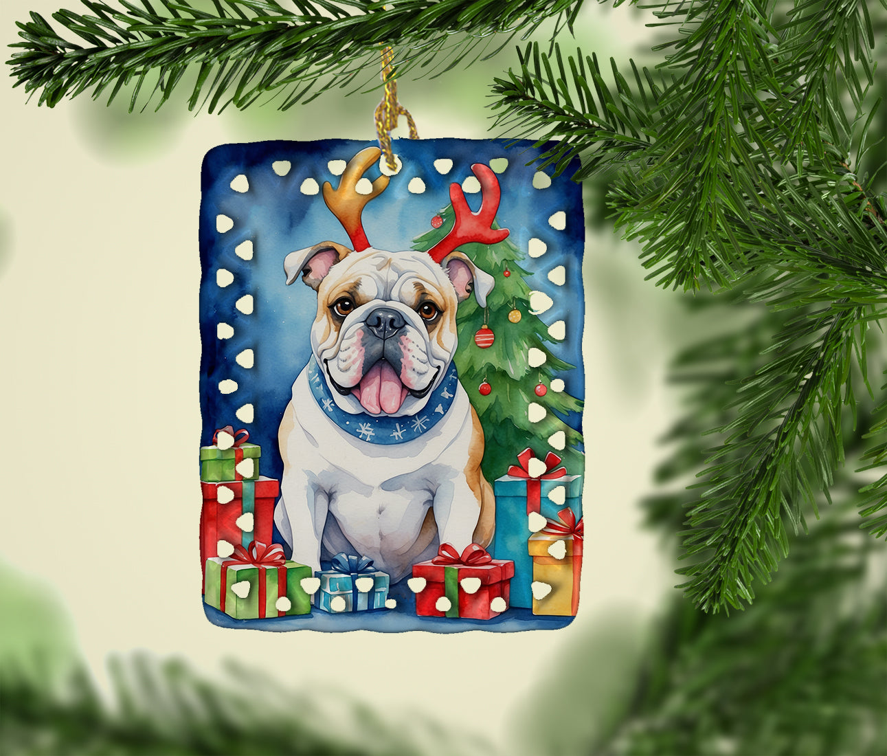 White English Bulldog Christmas Reindeer Porcelain Ornament