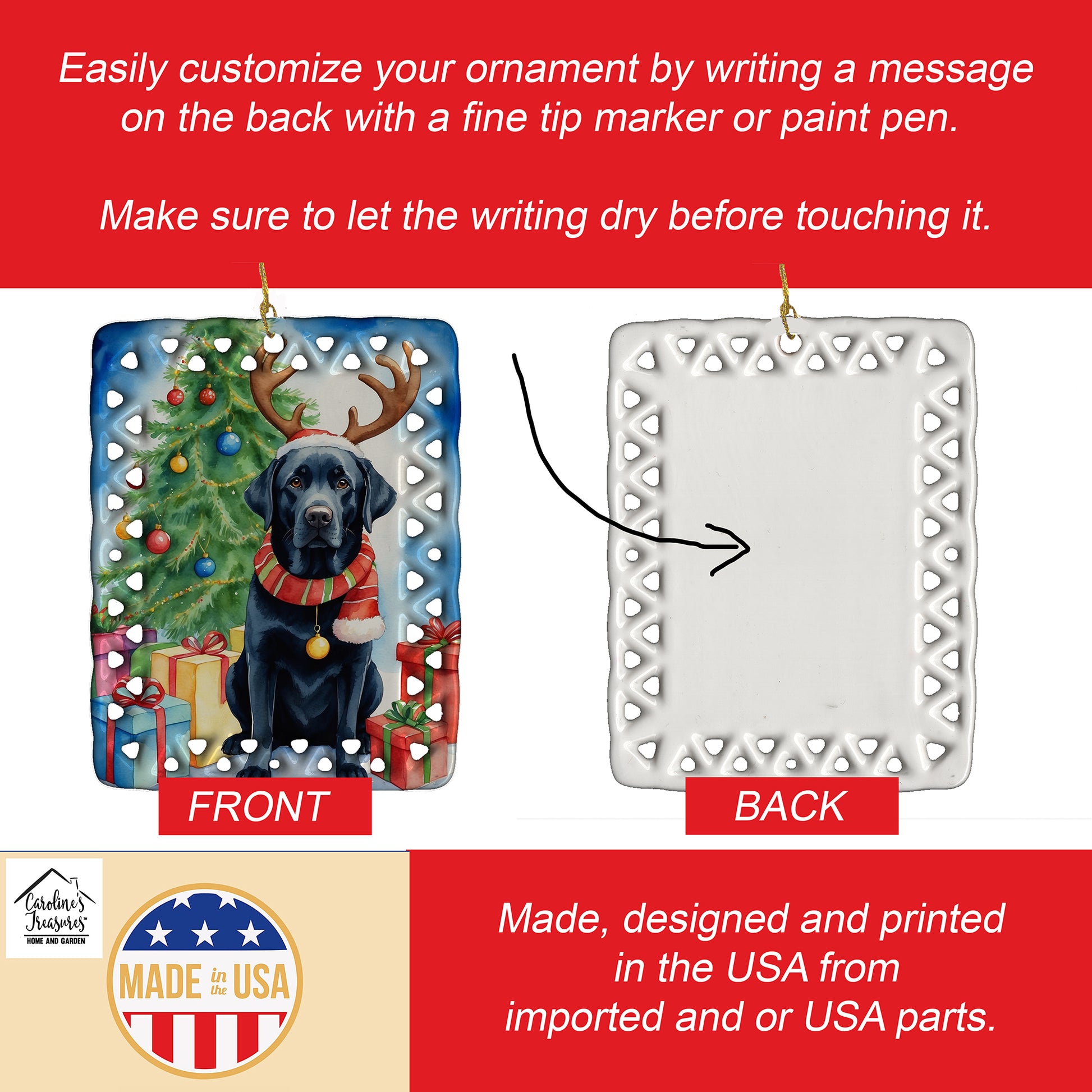 Porcelain Ornament featuring breed specific Labrador Retriever artwork. Celebrate Christmas with this Christmas Ornament. Add a unique, personal touch to your holiday decor with our Rectangular Lattice Porcelain Ornament. Perfect for creating cherished memories, this high-quality ornament shines under festive lights, reflecting warmth and joy throughout your Christmas tree. Crafted with a glossy finish, it showcases vibrant, full-color artwork contributed by our talented artists, ensuring your tree is adorned with a burst of color and holiday spirit. What sets this Porcelain Ornament apart is its customizable white back. Use a paint pen or permanent marker to write a heartfelt message, commemorate a special year, or mark an unforgettable date, turning this ornament into a keepsake that will be treasured for years to come. For best results, allow any personalization to dry thoroughly before handling. Each ornament comes complete with a delicate gold cord, making it easy to hang and display. Proudly made in the USA, this ornament measures 3.375 x 2.625 inches and is a thoughtful gift for pet sitters, teachers, family members, or anyone who would appreciate a little extra holiday magic. Bring style, charm, and a touch of personal meaning to your Christmas tree with this beautifully designed ornament..