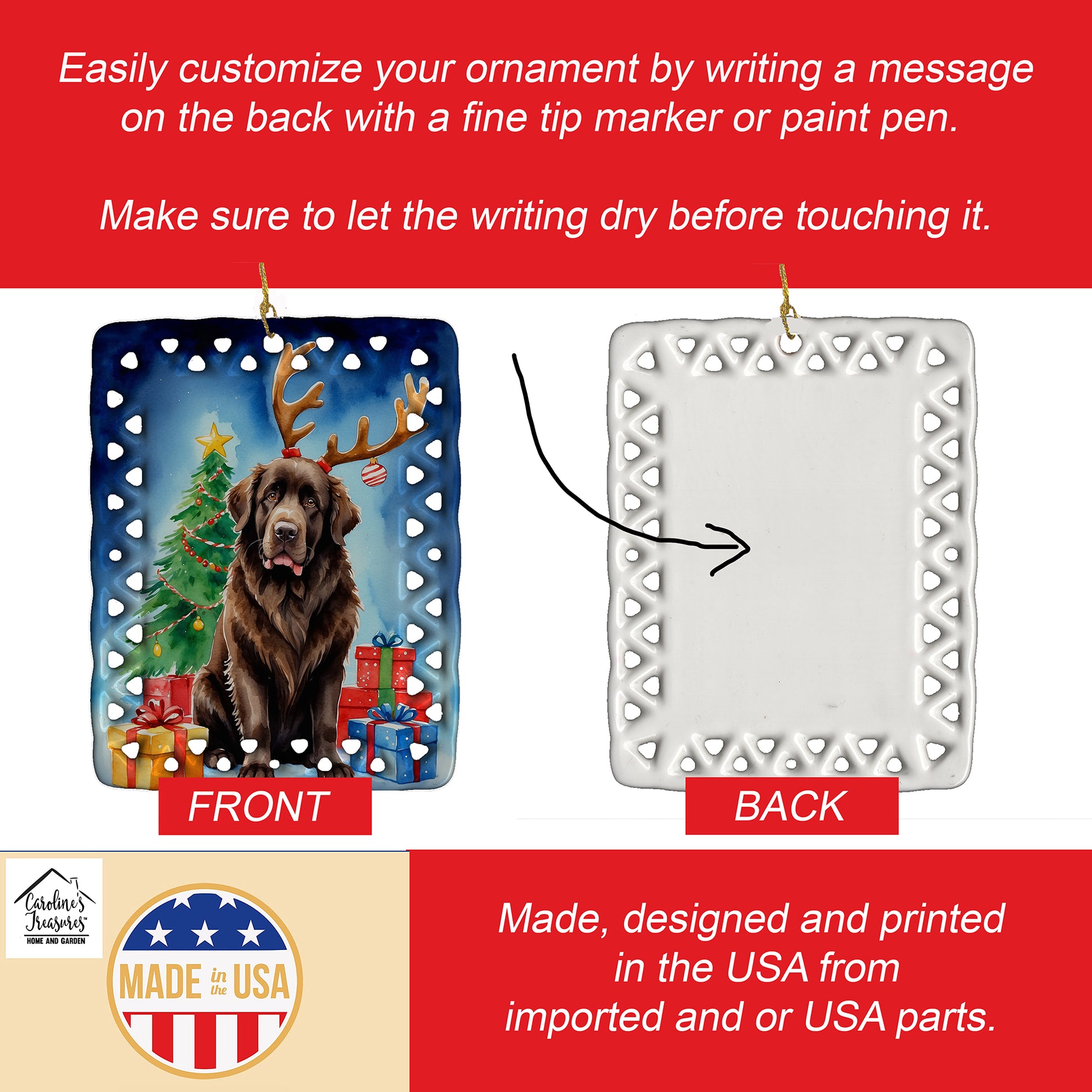 Porcelain Ornament featuring breed specific Newfoundland artwork. Celebrate Christmas with this Christmas Ornament. Add a unique, personal touch to your holiday decor with our Rectangular Lattice Porcelain Ornament. Perfect for creating cherished memories, this high-quality ornament shines under festive lights, reflecting warmth and joy throughout your Christmas tree. Crafted with a glossy finish, it showcases vibrant, full-color artwork contributed by our talented artists, ensuring your tree is adorned with a burst of color and holiday spirit. What sets this Porcelain Ornament apart is its customizable white back. Use a paint pen or permanent marker to write a heartfelt message, commemorate a special year, or mark an unforgettable date, turning this ornament into a keepsake that will be treasured for years to come. For best results, allow any personalization to dry thoroughly before handling. Each ornament comes complete with a delicate gold cord, making it easy to hang and display. Proudly made in the USA, this ornament measures 3.375 x 2.625 inches and is a thoughtful gift for pet sitters, teachers, family members, or anyone who would appreciate a little extra holiday magic. Bring style, charm, and a touch of personal meaning to your Christmas tree with this beautifully designed ornament..