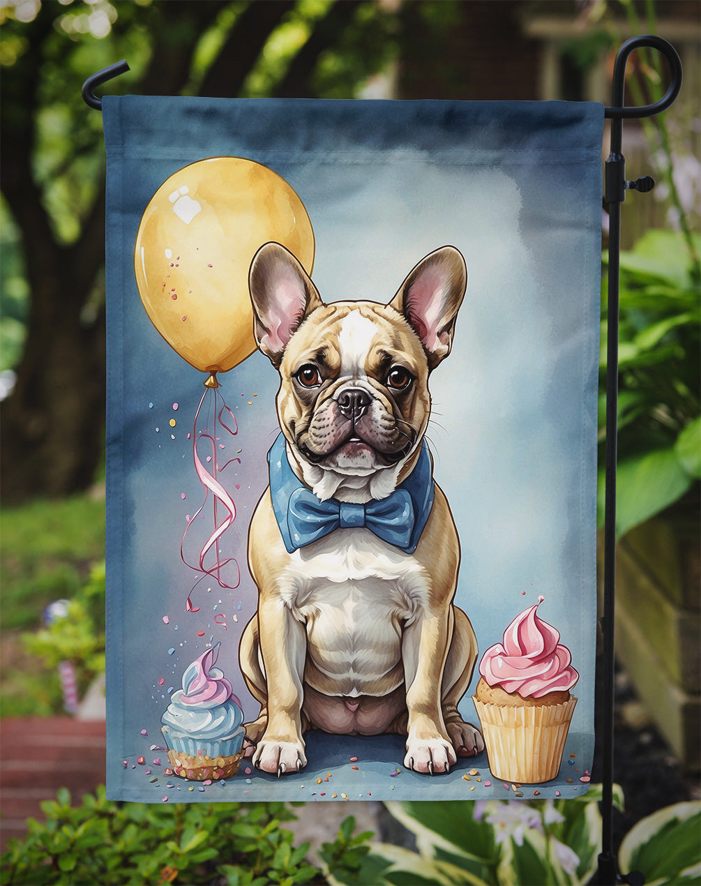 Garden Flag featuring breed specific French Bulldog artwork. Celebrate Birthday with this Birthday Garden Flag. Enhance the beauty of your garden, patio, or yard with Caroline's Treasures Decorative Garden Flag, proudly made in the USA. Crafted from two pieces of thick, double-sided polyester fabric, this 2-ply garden flag is designed to withstand various weather conditions, making it water-resistant and weatherproof. Featuring correctly readable words on both sides, this garden flag offers a delightful visual experience from any angle. With its heavier weight, it stands out among other garden flags, ensuring stability and durability even in wind, rain, and snow. Measuring approximately 11 1/4 inches by 15 1/2 inches, this flag allows you to personalize your outdoor decor. It comes with a 1 1/2-inch sleeve sewn in, allowing easy attachment to any standard garden flag stand or garden size porch hanger (sold separately). Make a statement in your outdoor space with Caroline's Treasures Decorative Garden Flag, a vibrant and high-quality flag that adds color and personality to your surroundings. Proudly made in the USA, it's a symbol of quality craftsmanship and attention to detail.