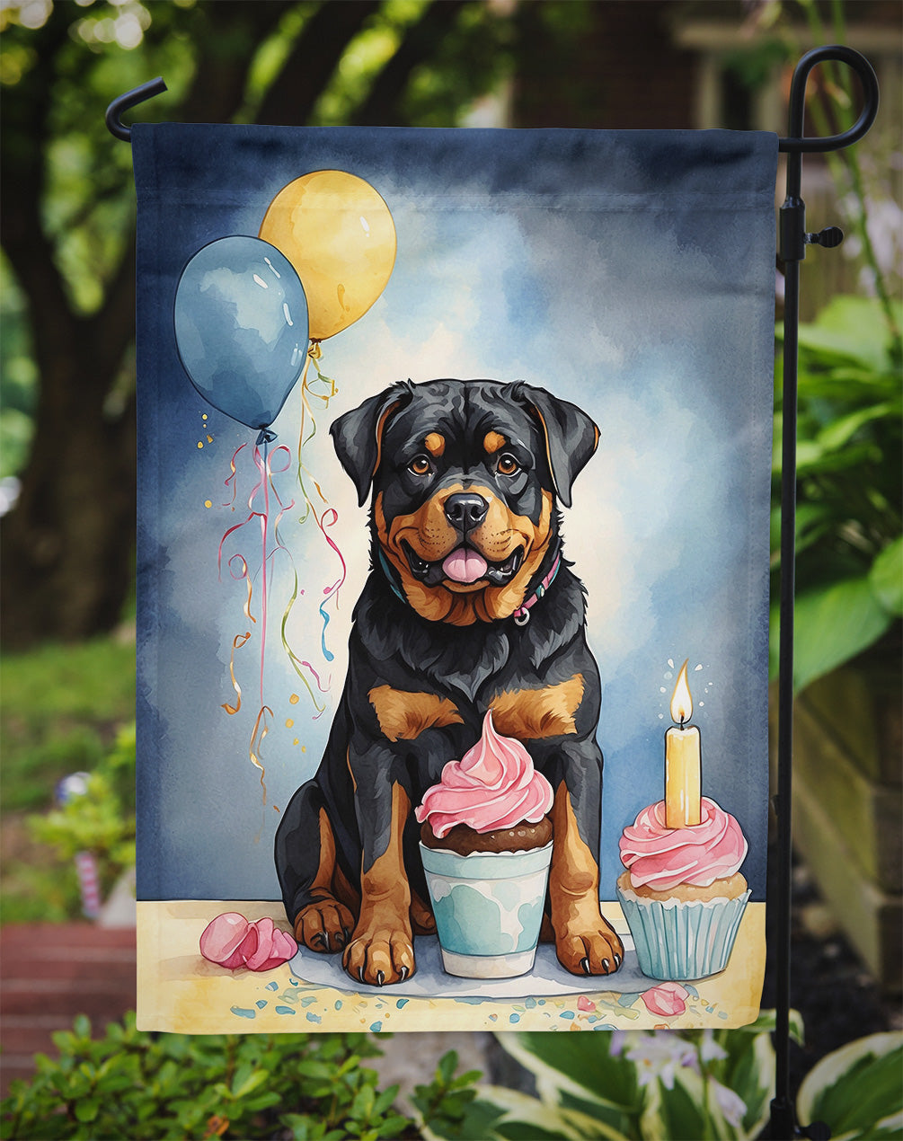 Garden Flag featuring breed specific Rottweiler artwork. Celebrate Birthday with this Birthday Garden Flag. Enhance the beauty of your garden, patio, or yard with Caroline's Treasures Decorative Garden Flag, proudly made in the USA. Crafted from two pieces of thick, double-sided polyester fabric, this 2-ply garden flag is designed to withstand various weather conditions, making it water-resistant and weatherproof. Featuring correctly readable words on both sides, this garden flag offers a delightful visual experience from any angle. With its heavier weight, it stands out among other garden flags, ensuring stability and durability even in wind, rain, and snow. Measuring approximately 11 1/4 inches by 15 1/2 inches, this flag allows you to personalize your outdoor decor. It comes with a 1 1/2-inch sleeve sewn in, allowing easy attachment to any standard garden flag stand or garden size porch hanger (sold separately). Make a statement in your outdoor space with Caroline's Treasures Decorative Garden Flag, a vibrant and high-quality flag that adds color and personality to your surroundings. Proudly made in the USA, it's a symbol of quality craftsmanship and attention to detail.
