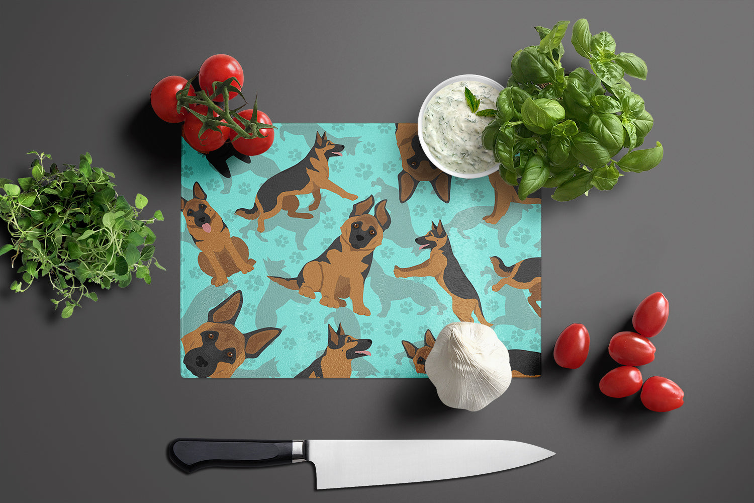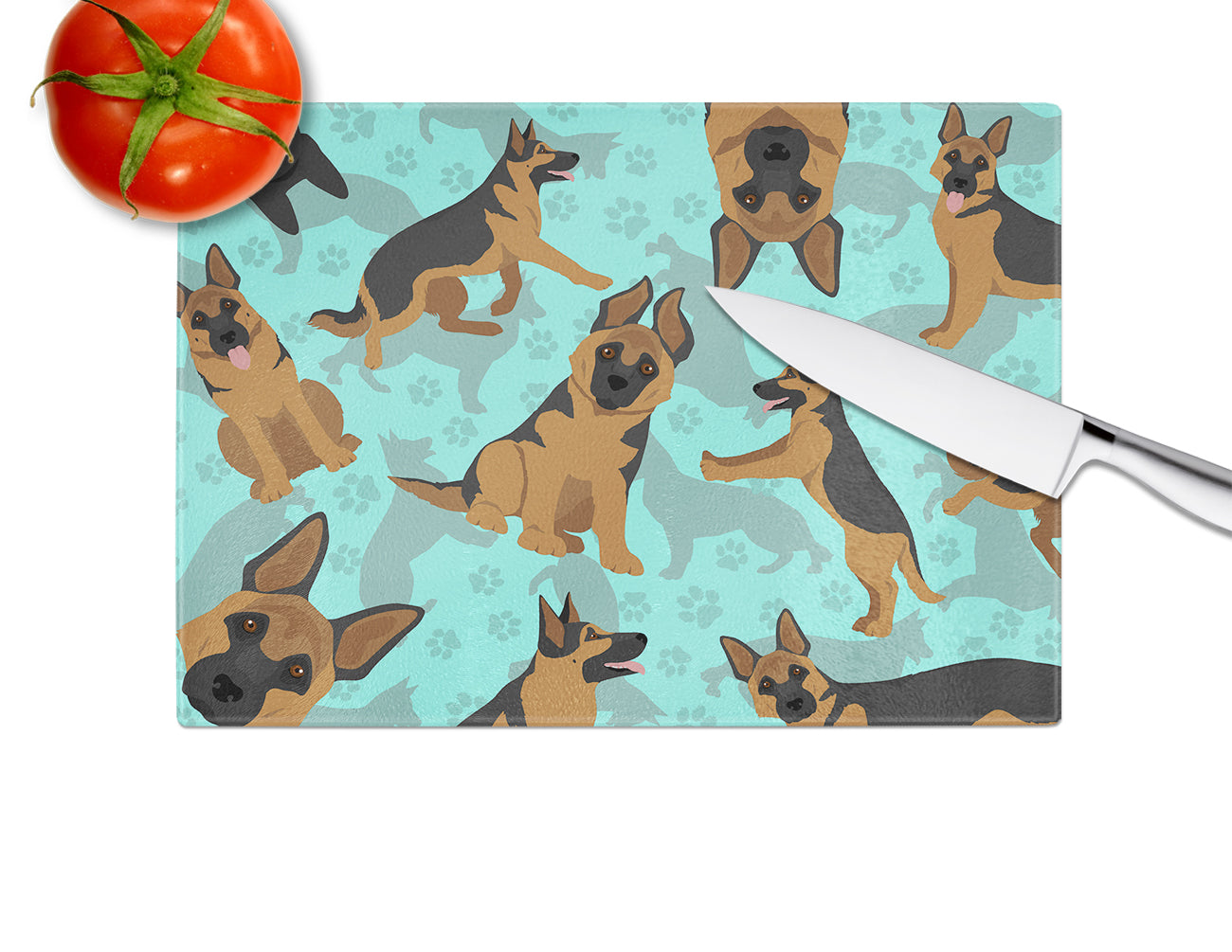 Glass Cutting Board Large featuring breed specific German Shepherd artwork. Large Tempered Glass Cutting Board from Caroline's Treasures colorful kitchen product line is heat resistant and should be hand wash only. This chopping board is bright and colorful. This cutting board is made of tempered glass. These unique cutting boards feature artwork from some of your favorite artists. The Board measures 15 inches high and 12 inches long. They will beautify and protect your counter top. They are heat resistant, non skid feet, and virtually unbreakable! The corners are rounded to help protect the board. Feet bumpers are included to keep the cutting board in place while in use. Cutting boards are printed and assembled in the United States.