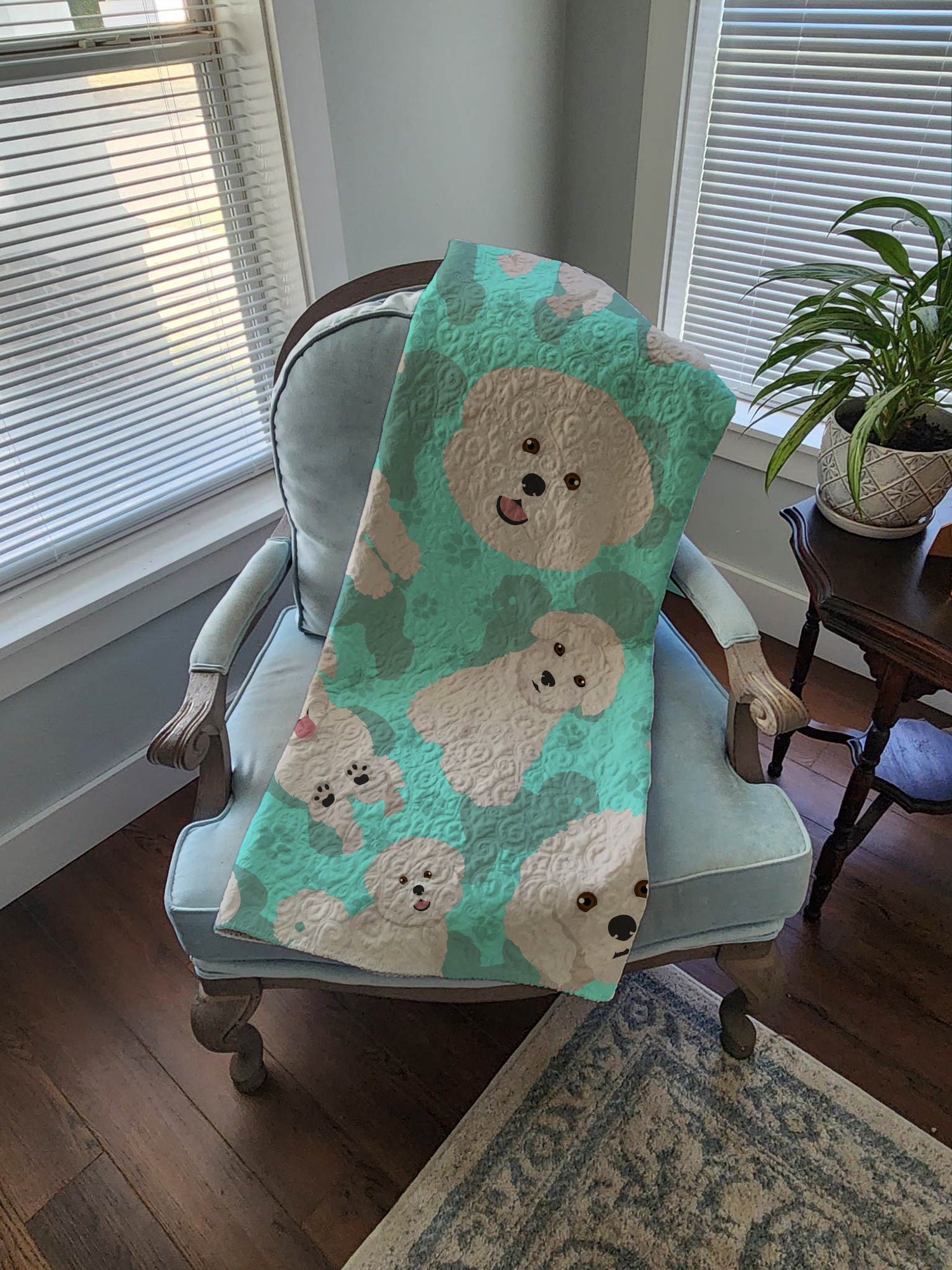 Quilted Blanket 50x60 featuring breed specific Bichon Frise artwork. Our quilted throw blanket is a must-have for anyone who values Form as well as Function! It measures 50 inches by 60 inches and is trimmed with a whip stitch. This heavier blanket is sure to keep away any draft or breeze without causing you to overheat. Use it as an accent piece for furniture, wrap your child in its comforting warmth, keep your pet calm on visits to the vet's office, or use it as an extra layer of softness for any crib or kennel. Here at Caroline's Treasures, we know that some dogs love to share sleeping accommodations with their favorite humans; This blanket makes a great coverlet for the foot of your bed so your four-legged companion has a warm, soft area to snooze on all night without getting your bedding dirty over time. When the blanket does get too many pawprints on it, simply throw it in the wash and follow the care instructions on the tag to restore it to like-new condition. This blanket is made of 67% Polyester and 33% Cotton to ensure durability and comfort. Filled with 100% Cotton and quilted, it does an excellent job at keeping the chill at bay. This is from Caroline's Treasures Dogs category of products.