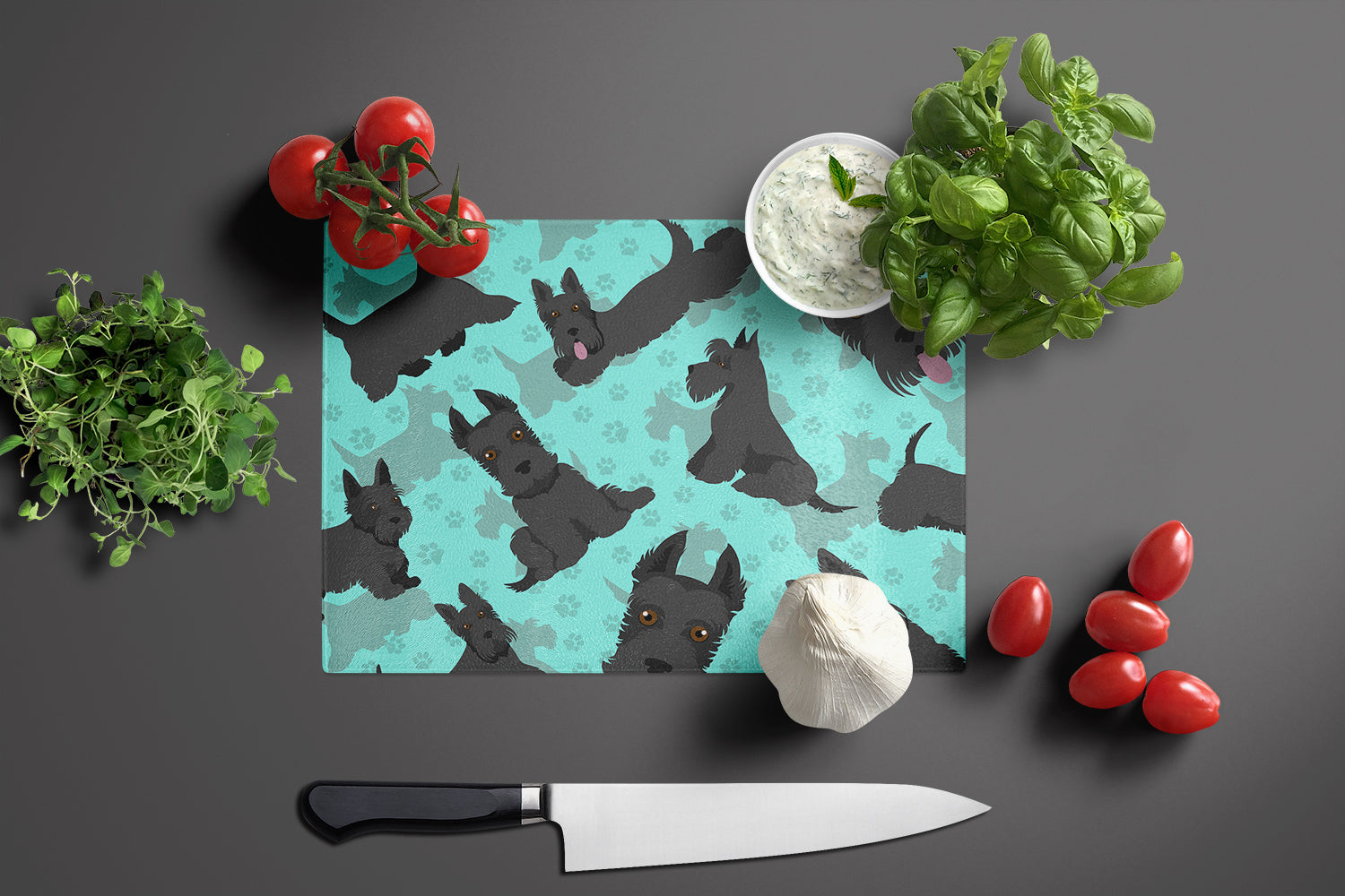 Glass Cutting Board Large featuring breed specific Scottish Terrier artwork. Large Tempered Glass Cutting Board from Caroline's Treasures colorful kitchen product line is heat resistant and should be hand wash only. This chopping board is bright and colorful. This cutting board is made of tempered glass. These unique cutting boards feature artwork from some of your favorite artists. The Board measures 15 inches high and 12 inches long. They will beautify and protect your counter top. They are heat resistant, non skid feet, and virtually unbreakable! The corners are rounded to help protect the board. Feet bumpers are included to keep the cutting board in place while in use. Cutting boards are printed and assembled in the United States.