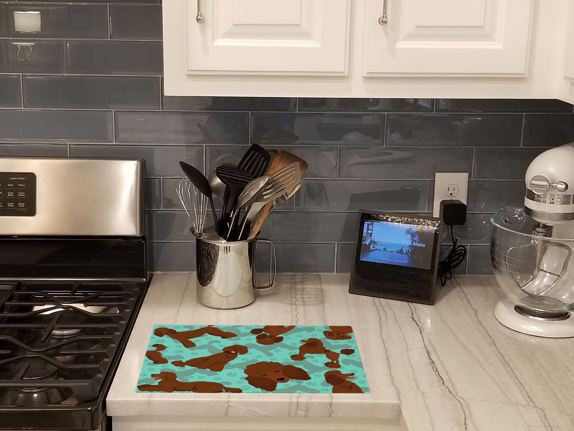 Glass Cutting Board Large featuring breed specific Poodle artwork. Large Tempered Glass Cutting Board from Caroline's Treasures colorful kitchen product line is heat resistant and should be hand wash only. This chopping board is bright and colorful. This cutting board is made of tempered glass. These unique cutting boards feature artwork from some of your favorite artists. The Board measures 15 inches high and 12 inches long. They will beautify and protect your counter top. They are heat resistant, non skid feet, and virtually unbreakable! The corners are rounded to help protect the board. Feet bumpers are included to keep the cutting board in place while in use. Cutting boards are printed and assembled in the United States.