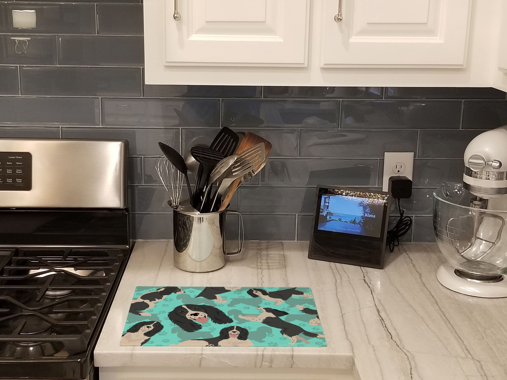Black and White English Springer Spaniel Glass Cutting Board Large