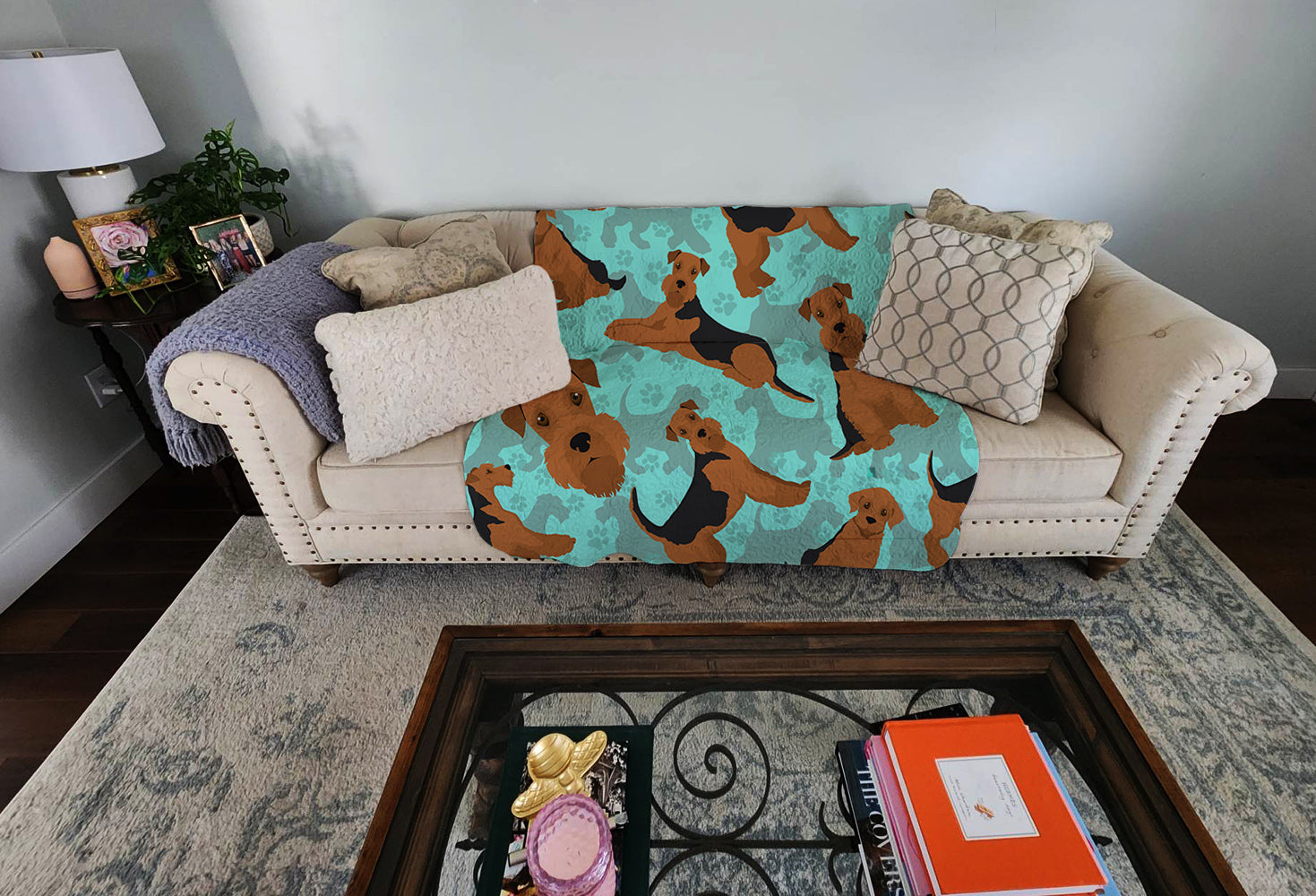 Quilted Blanket 50x60 featuring breed specific Airedale Terrier artwork. Our quilted throw blanket is a must-have for anyone who values Form as well as Function! It measures 50 inches by 60 inches and is trimmed with a whip stitch. This heavier blanket is sure to keep away any draft or breeze without causing you to overheat. Use it as an accent piece for furniture, wrap your child in its comforting warmth, keep your pet calm on visits to the vet's office, or use it as an extra layer of softness for any crib or kennel. Here at Caroline's Treasures, we know that some dogs love to share sleeping accommodations with their favorite humans; This blanket makes a great coverlet for the foot of your bed so your four-legged companion has a warm, soft area to snooze on all night without getting your bedding dirty over time. When the blanket does get too many pawprints on it, simply throw it in the wash and follow the care instructions on the tag to restore it to like-new condition. This blanket is made of 67% Polyester and 33% Cotton to ensure durability and comfort. Filled with 100% Cotton and quilted, it does an excellent job at keeping the chill at bay. This is from Caroline's Treasures Dogs category of products.