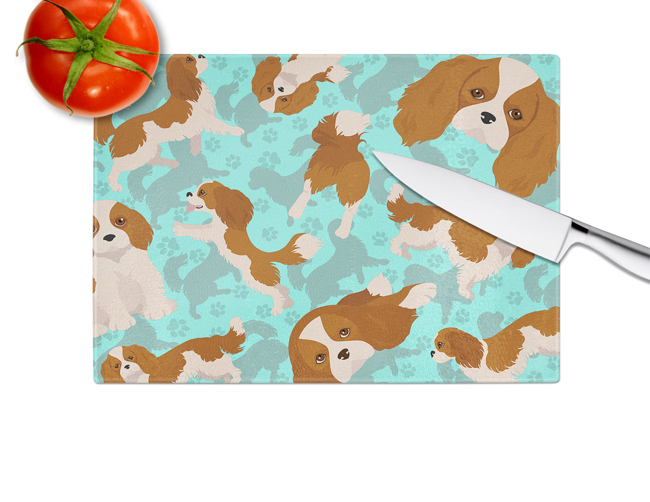 Glass Cutting Board Large featuring breed specific Cavalier King Charles Spaniel artwork. Large Tempered Glass Cutting Board from Caroline's Treasures colorful kitchen product line is heat resistant and should be hand wash only. This chopping board is bright and colorful. This cutting board is made of tempered glass. These unique cutting boards feature artwork from some of your favorite artists. The Board measures 15 inches high and 12 inches long. They will beautify and protect your counter top. They are heat resistant, non skid feet, and virtually unbreakable! The corners are rounded to help protect the board. Feet bumpers are included to keep the cutting board in place while in use. Cutting boards are printed and assembled in the United States.