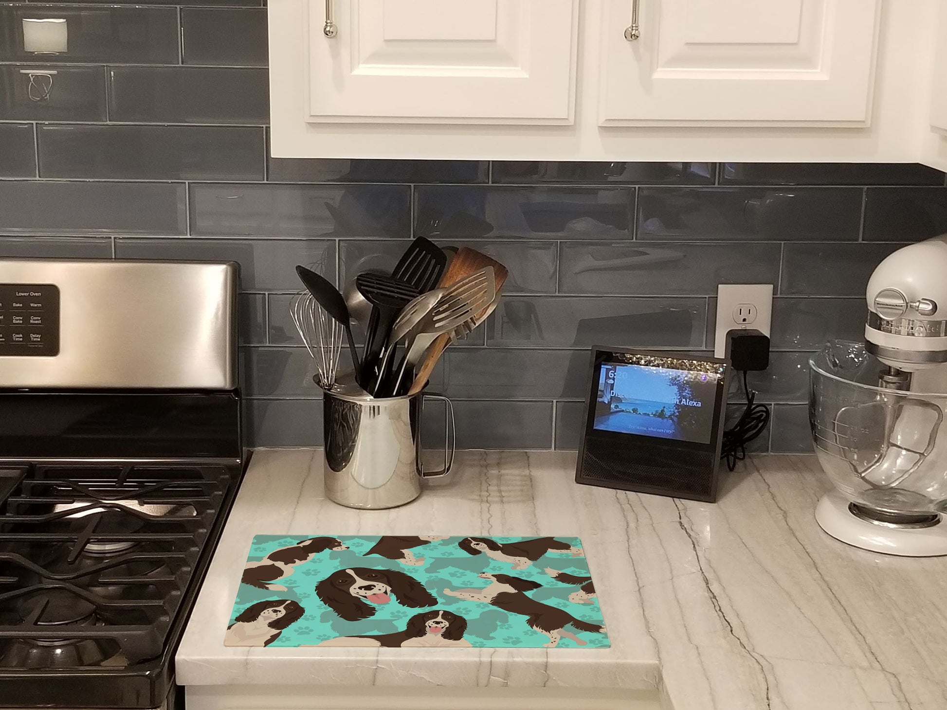 Glass Cutting Board Large featuring breed specific English Springer Spaniel artwork. Large Tempered Glass Cutting Board from Caroline's Treasures colorful kitchen product line is heat resistant and should be hand wash only. This chopping board is bright and colorful. This cutting board is made of tempered glass. These unique cutting boards feature artwork from some of your favorite artists. The Board measures 15 inches high and 12 inches long. They will beautify and protect your counter top. They are heat resistant, non skid feet, and virtually unbreakable! The corners are rounded to help protect the board. Feet bumpers are included to keep the cutting board in place while in use. Cutting boards are printed and assembled in the United States.