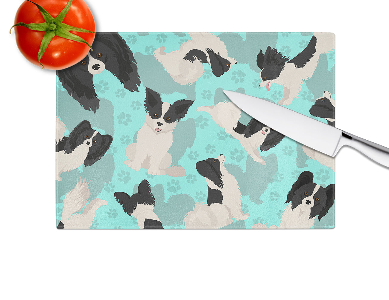 Glass Cutting Board Large featuring breed specific Papillon artwork. Large Tempered Glass Cutting Board from Caroline's Treasures colorful kitchen product line is heat resistant and should be hand wash only. This chopping board is bright and colorful. This cutting board is made of tempered glass. These unique cutting boards feature artwork from some of your favorite artists. The Board measures 15 inches high and 12 inches long. They will beautify and protect your counter top. They are heat resistant, non skid feet, and virtually unbreakable! The corners are rounded to help protect the board. Feet bumpers are included to keep the cutting board in place while in use. Cutting boards are printed and assembled in the United States.