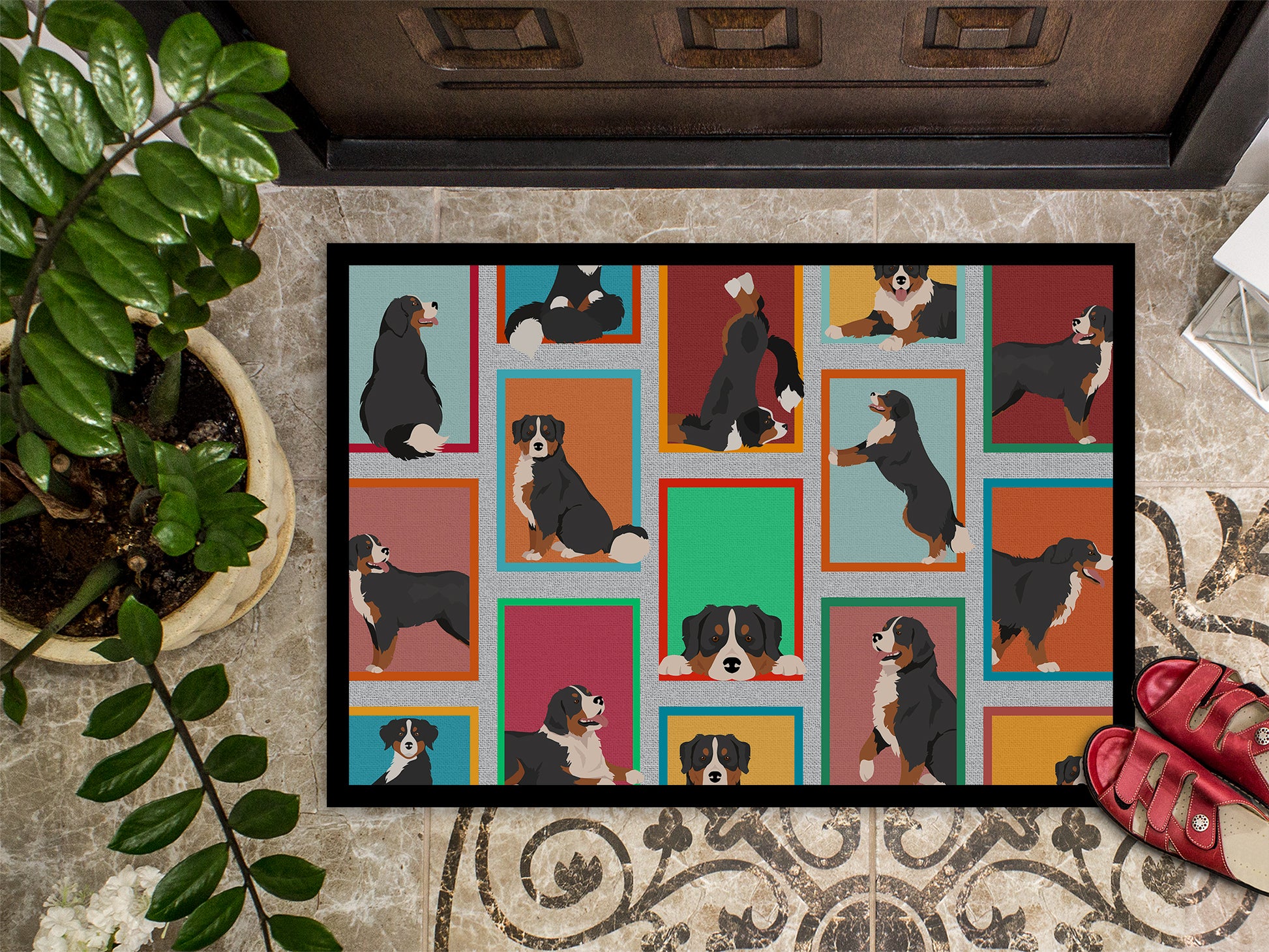 Doormat featuring breed specific Bernese Mountain Dog artwork. Welcome your guests in style with our Artwork Door Mat, designed to withstand almost any weather condition. This mat, measuring approximately 24 by 36 inches, is held together by durable black binding tape. Its top layer, composed of polyester felt, is dyed with the eye-catching image you see on the mat. A few layers below provide the mat with stability, while its rubber bottom is stamped to help prevent slipping and ensures safety. Our mat works wonderfully as both an indoor or outdoor door mat. For cleaning, simply hose it off with water or use a power washer - no need for any cleaner that produces suds. Avoid scrubbing with a brush, instead, opt for the vacuum on floor setting. Designed manufactured and printed in the USA, this mat is a perfect addition to your porch, outdoor kitchen, entryway, or any indoor space. Its unique design makes it a charming decorative rug that greets your guests and adds a stylish touch to your home decor.
