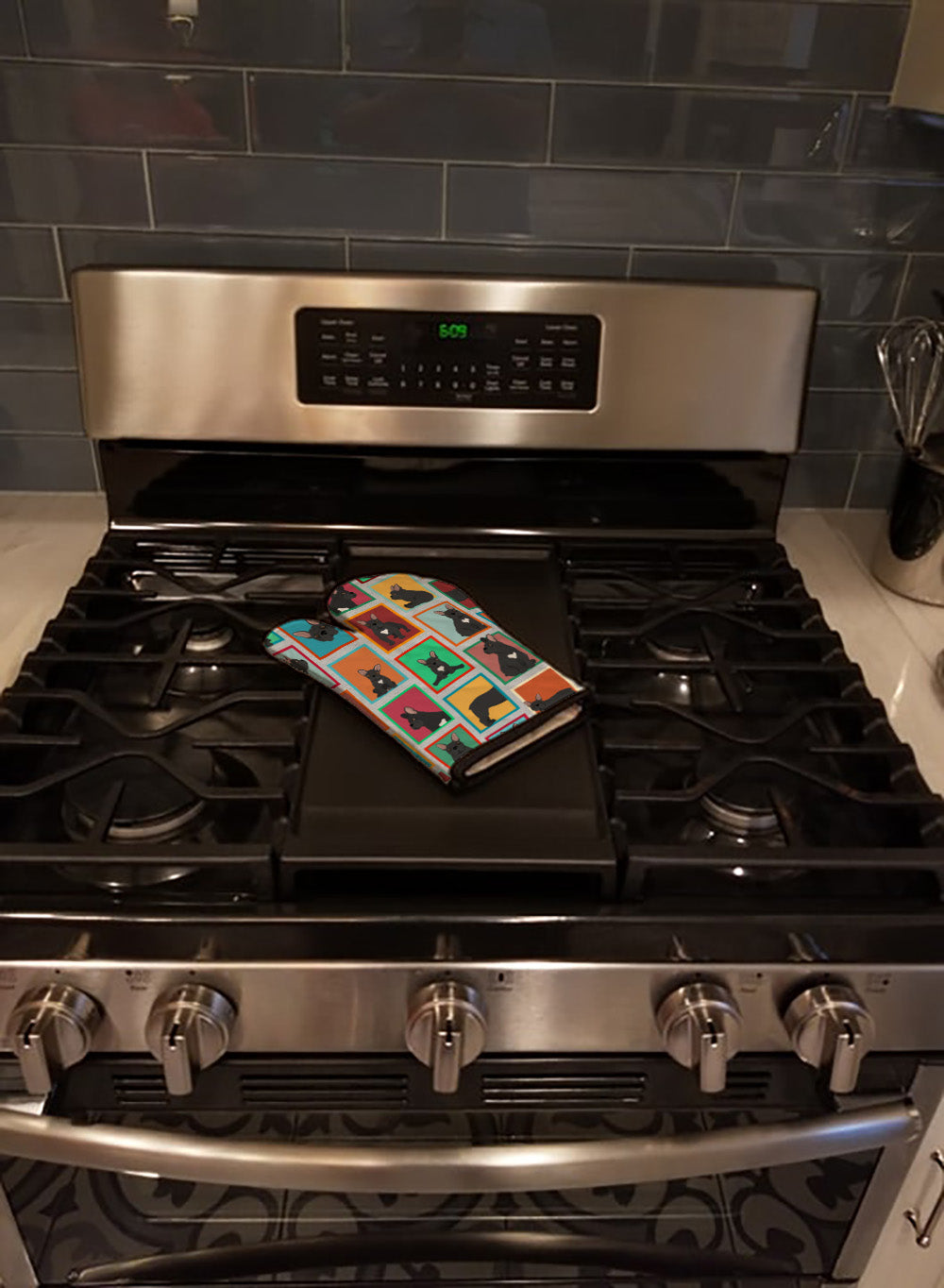 Oven Mitt featuring breed specific French Bulldog artwork. Large Right Hand Thick Heat Resistant Oven Mitt. Layers of quilted protection on each side of the mitt provide excellent resistance to heat. The beautifully printed artwork on the front of the mitt provides an extra statement to your current kitchen decor. Great for your favorite Mom, Chef or the best BBQer that you know. Measuring about 12 inches long and about 8 1/2 inches at it's widest point. A Black bias tape trim finishes the oven mitt with a hoop to act as a hanger. This large oven mitt fits a very diverse size of hands The quilting process may cause the oven mitt to become stiff when it first arrives. Through use and washing the oven mitt will become more plyable. The center fabric is a product called Insul-Bright. Insul-Bright consists of polyester fivers needle- punched through a nonwoven substrate and throught a reflective metallized film. The needled material breathes and will not break down with washing. The fiver resists conduction while the reflective metalilized film resists radian energy. The energy, hot or cold, is reflected back to its source. Machine wash and tumble dry.