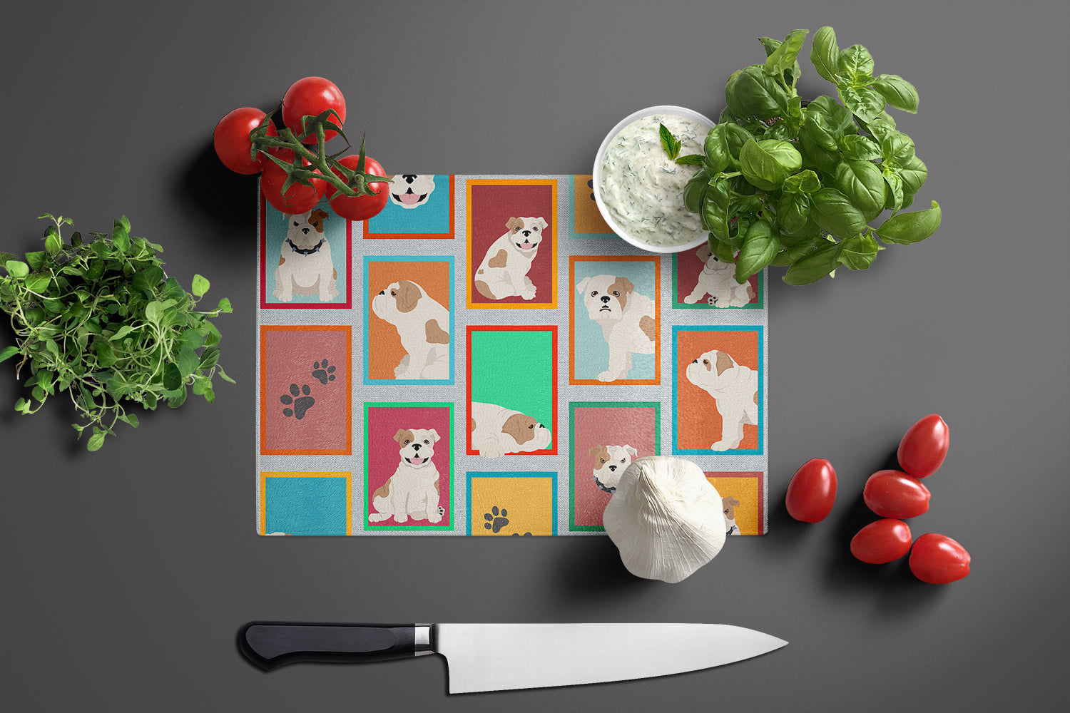 Glass Cutting Board featuring breed specific English Bulldog artwork. Introduce your kitchen to the vibrant, large Decorative Glass Cutting Board from Caroline's Treasures. Crafted from resilient tempered glass, this board is not only a utilitarian necessity but also a colorful art piece. With its generous dimensions of 15 inches in height and 12 inches in length, it offers ample space for all your cutting needs. Every piece showcases captivating artwork from distinguished artists, bringing an aesthetic edge to your kitchen. Beyond its attractive design, this cutting board ensures your countertop stays pristine and unscathed, owing to its heat-resistant properties. Engineered with user convenience in mind, it features non-skid feet for stability, and rounded corners for additional safety. Its robust construction renders it virtually unbreakable, guaranteeing longevity. The board comes with protective feet bumpers, maintaining its position during use. This product is recommended to be hand washed only. Proudly printed and assembled in the United States, this cutting board exemplifies superior craftsmanship. With Caroline's Treasures' Decorative Glass Cutting Board, you're investing in a blend of functionality and artistic flair.