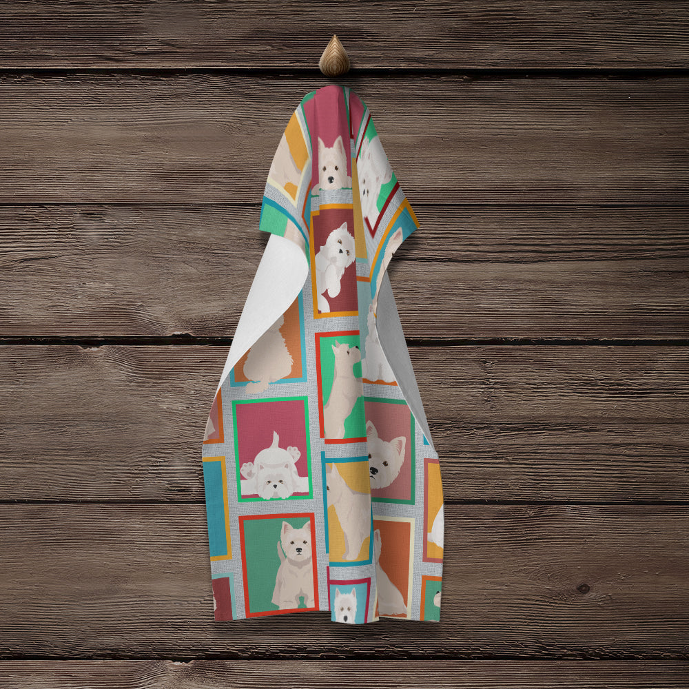 Kitchen Towel featuring breed specific Westie artwork. Experience the perfect blend of aesthetic appeal and functional excellence with our Plush Velour Kitchen Towels. These are not your ordinary decorative kitchen towels that gather dust. Instead, they are designed to be as practical as they are stylish. The front layer of our towel is constructed from a minky plush polyester, known for its durability and color retention. Unlike conventional kitchen towels, the artwork on our towels is dyed directly into the fabric, ensuring vibrant colors that last. Polish your glassware to a brilliant sparkle using the plush front side of the towel. Flip to the back, crafted from 100% cotton terry loop, to exploit its exceptional absorbency for drying dishes or wiping down counters. Our kitchen towels redefine the concept of functional art, offering lasting quality that maintains the towel's shape over time. Measuring 15 inches by 25 inches and weighing 2.3 lbs per dozen, these towels deliver an overwhelming sensory experience with their soft, plush, and smooth texture. The edges are meticulously finished with binding, enhancing their durability and visual appeal. For your convenience, these towels are machine washable and can be dried on low heat. After the first wash, the top fabric becomes even softer and fluffier, eliminating the need for ironing. Treat your kitchen to the luxury and functionality it deserves with our plush velour kitchen towels.