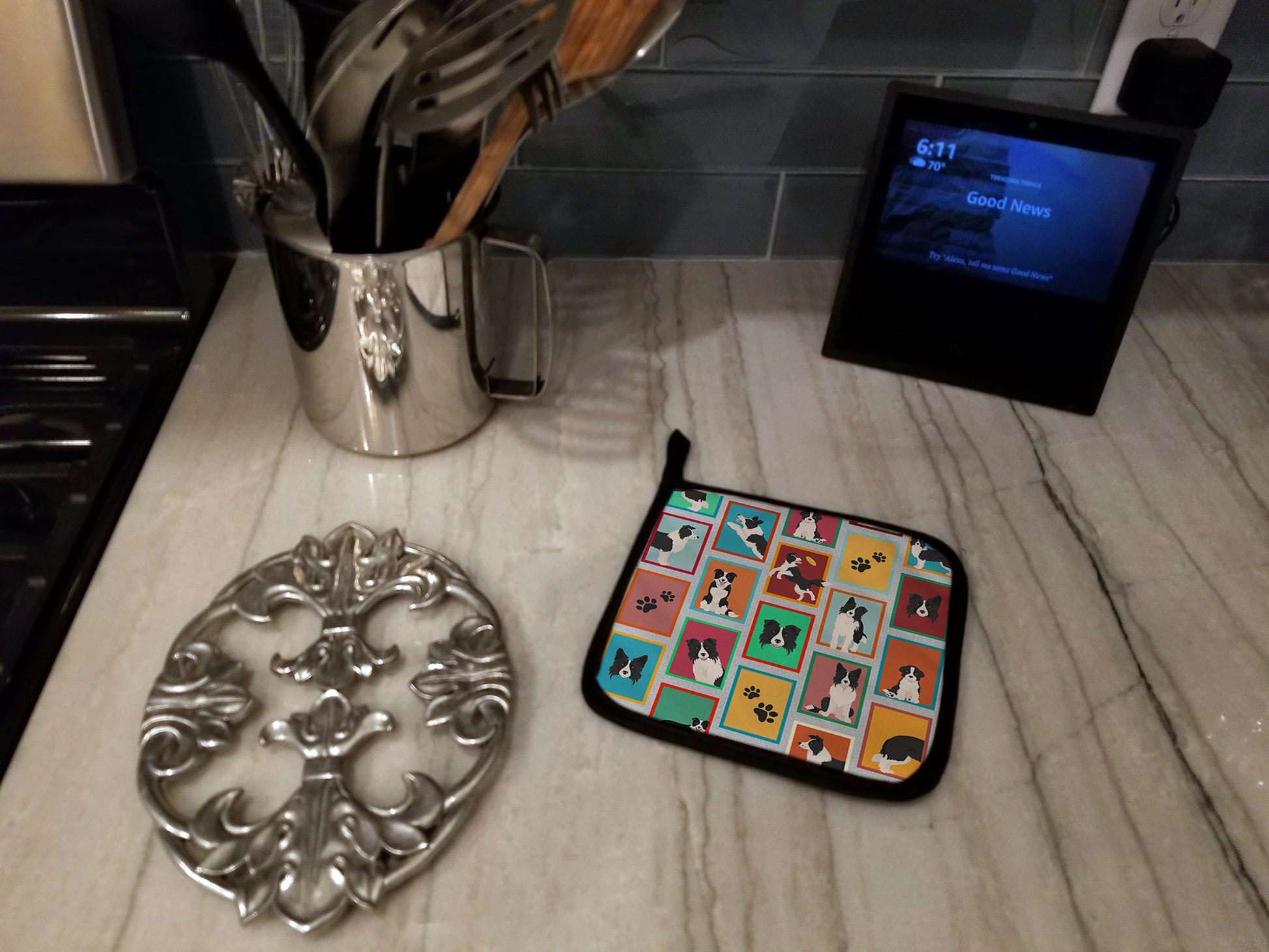 Pair of Pot Holders featuring breed specific Border Collie artwork. A Pair of Pot Holders to match your kitchen decor. Made in the USA these are thick and functional. Full color artwork decorates the front polyester fabric of the hot pad and accented by a black trim. Use these at as a trivet for your Thanksgiving or Christmas tablescape. Filled with insulated fabric and quilted for durability. These colorful pot holders will make a great gift for your favorite home cook or executive chef. Each pot holder measures approximately 7 1/2 inches by 7 1/2 inches. A hanging tab is included.