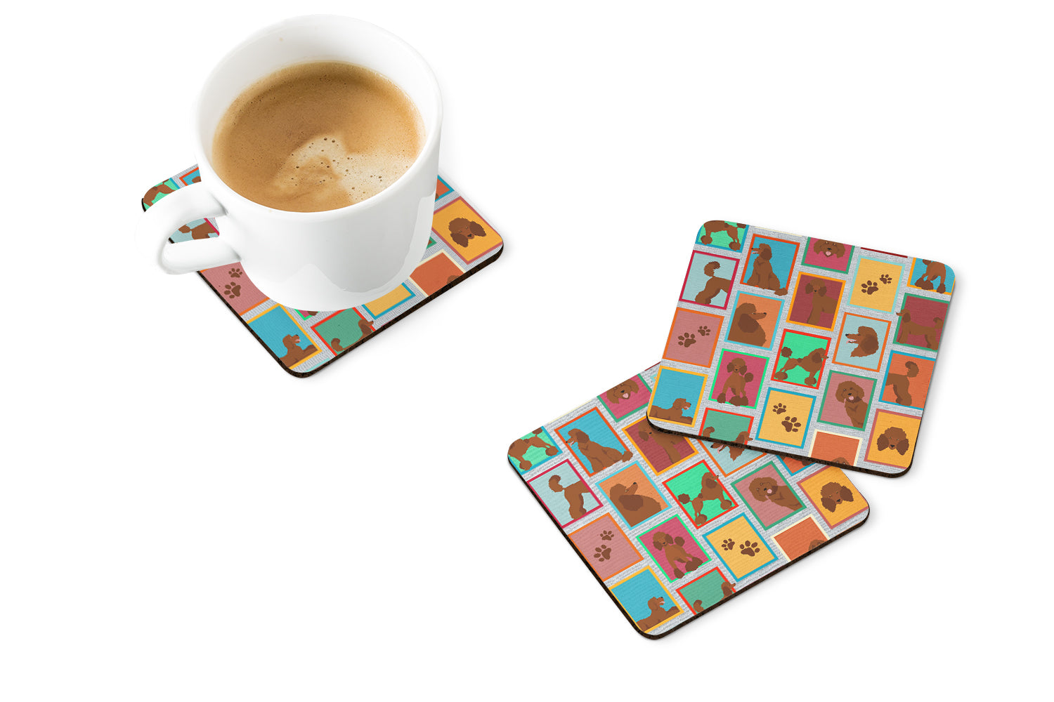 Foam Coasters featuring breed specific Poodle artwork. Presenting our Set of 4 Foam Coasters, a stylish and practical addition to your table setting. Each square coaster, measuring 3 1/2 inches by 3 1/2 inches, is perfectly sized to accommodate various drinkware, from coffee mugs to tumblers. These coasters stand out with their full-color artwork, permanently dyed onto the material for a vibrant and fade-resistant finish. They're not just functional, they're a fashionable statement, adding a touch of flair to any gathering or event. Our foam coasters serve a dual purpose - they protect your table from water stains and are perfect for both hot and cold drinks. The material used is similar to that of our high-quality mouse pads, ensuring durability and heat resistance. These coasters are easy to maintain - simply wash them in the top of your dishwasher and lay flat to dry. The design won't come off, ensuring they retain their vivid colors for years. Pair them with one of our insulated coolers or huggers for a cohesive, thoughtful gift set. Enhance your beverage experience with our Set of 4 Foam Coasters.