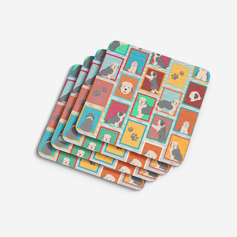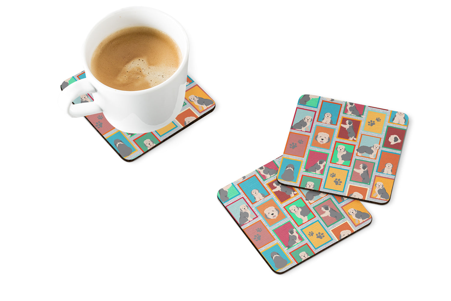 Foam Coasters featuring breed specific Old English Sheepdog artwork. Presenting our Set of 4 Foam Coasters, a stylish and practical addition to your table setting. Each square coaster, measuring 3 1/2 inches by 3 1/2 inches, is perfectly sized to accommodate various drinkware, from coffee mugs to tumblers. These coasters stand out with their full-color artwork, permanently dyed onto the material for a vibrant and fade-resistant finish. They're not just functional, they're a fashionable statement, adding a touch of flair to any gathering or event. Our foam coasters serve a dual purpose - they protect your table from water stains and are perfect for both hot and cold drinks. The material used is similar to that of our high-quality mouse pads, ensuring durability and heat resistance. These coasters are easy to maintain - simply wash them in the top of your dishwasher and lay flat to dry. The design won't come off, ensuring they retain their vivid colors for years. Pair them with one of our insulated coolers or huggers for a cohesive, thoughtful gift set. Enhance your beverage experience with our Set of 4 Foam Coasters.