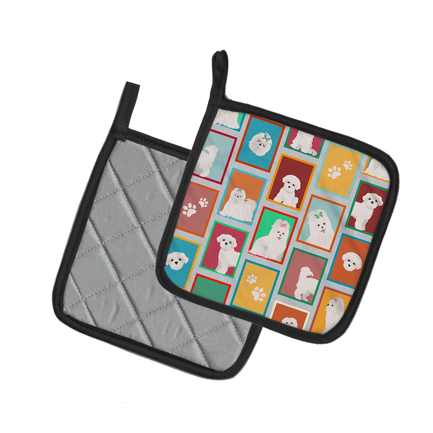 Pair of Pot Holders featuring breed specific Maltese artwork. A Pair of Pot Holders to match your kitchen decor. Made in the USA these are thick and functional. Full color artwork decorates the front polyester fabric of the hot pad and accented by a black trim. Use these at as a trivet for your Thanksgiving or Christmas tablescape. Filled with insulated fabric and quilted for durability. These colorful pot holders will make a great gift for your favorite home cook or executive chef. Each pot holder measures approximately 7 1/2 inches by 7 1/2 inches. A hanging tab is included.