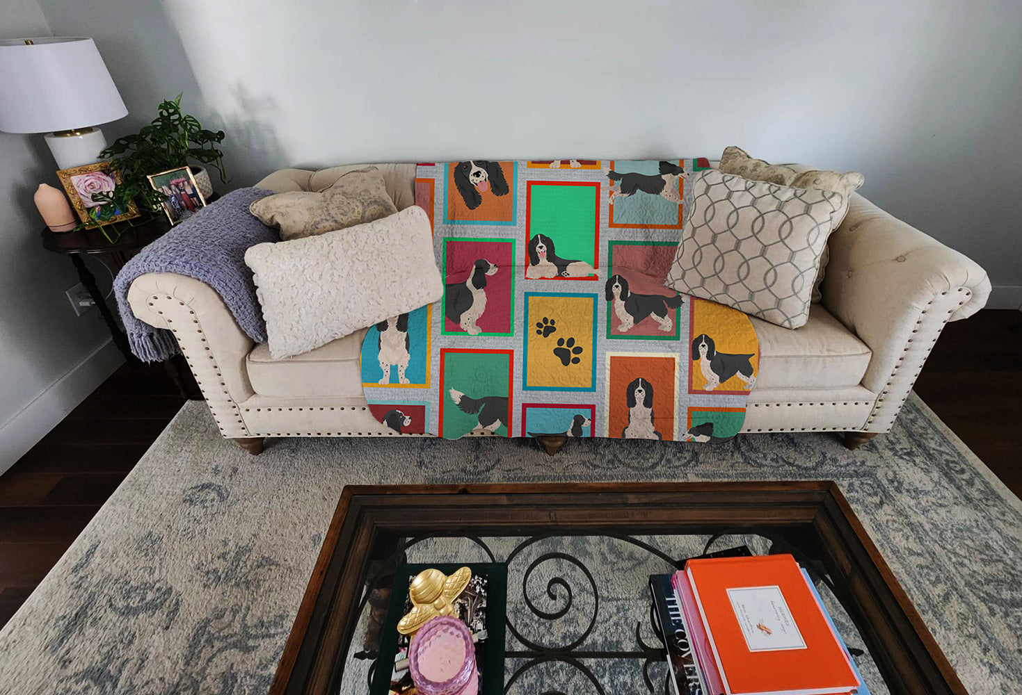 Quilted Blanket 50x60 featuring breed specific English Springer Spaniel artwork. This Quilted Blanket 50x60 is from Caroline's Treasures collection Lots of Dogs. Our quilted throw blanket is a must-have for anyone who values Form as well as Function! It measures 50 inches by 60 inches and is trimmed with a whip stitch. This heavier blanket is sure to keep away any draft or breeze without causing you to overheat. Use it as an accent piece for furniture, wrap your child in its comforting warmth, keep your pet calm on visits to the vet's office, or use it as an extra layer of softness for any crib or kennel. Here at Caroline's Treasures, we know that some dogs love to share sleeping accommodations with their favorite humans; This blanket makes a great coverlet for the foot of your bed so your four-legged companion has a warm, soft area to snooze on all night without getting your bedding dirty over time. When the blanket does get too many pawprints on it, simply throw it in the wash and follow the care instructions on the tag to restore it to like-new condition. This blanket is made of 67% Polyester and 33% Cotton to ensure durability and comfort. Filled with 100% Cotton and quilted, it does an excellent job at keeping the chill at bay. This is from Caroline's Treasures Dogs category of products.