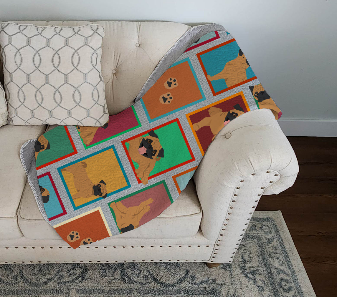 Quilted Blanket 50x60 featuring breed specific Pug artwork. This Quilted Blanket 50x60 is from Caroline's Treasures collection Lots of Dogs. Our quilted throw blanket is a must-have for anyone who values Form as well as Function! It measures 50 inches by 60 inches and is trimmed with a whip stitch. This heavier blanket is sure to keep away any draft or breeze without causing you to overheat. Use it as an accent piece for furniture, wrap your child in its comforting warmth, keep your pet calm on visits to the vet's office, or use it as an extra layer of softness for any crib or kennel. Here at Caroline's Treasures, we know that some dogs love to share sleeping accommodations with their favorite humans; This blanket makes a great coverlet for the foot of your bed so your four-legged companion has a warm, soft area to snooze on all night without getting your bedding dirty over time. When the blanket does get too many pawprints on it, simply throw it in the wash and follow the care instructions on the tag to restore it to like-new condition. This blanket is made of 67% Polyester and 33% Cotton to ensure durability and comfort. Filled with 100% Cotton and quilted, it does an excellent job at keeping the chill at bay. This is from Caroline's Treasures Dogs category of products.