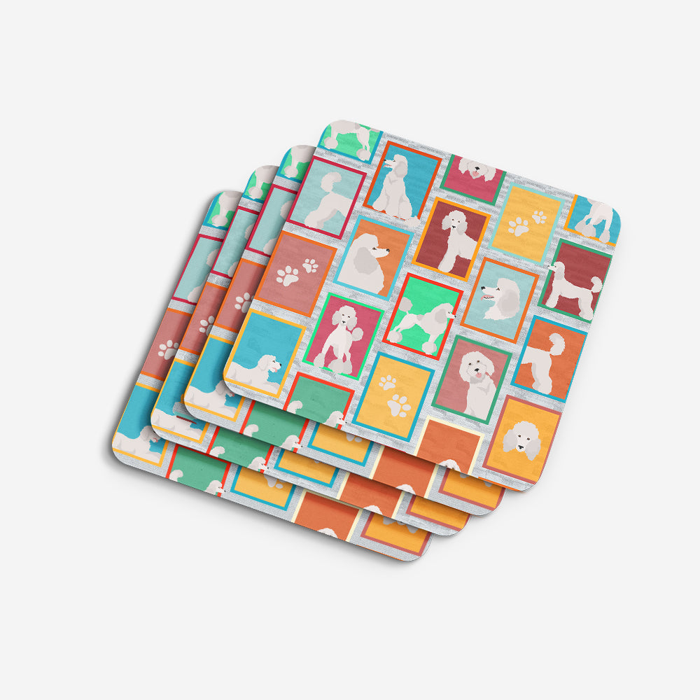Foam Coasters featuring breed specific Poodle artwork. Presenting our Set of 4 Foam Coasters, a stylish and practical addition to your table setting. Each square coaster, measuring 3 1/2 inches by 3 1/2 inches, is perfectly sized to accommodate various drinkware, from coffee mugs to tumblers. These coasters stand out with their full-color artwork, permanently dyed onto the material for a vibrant and fade-resistant finish. They're not just functional, they're a fashionable statement, adding a touch of flair to any gathering or event. Our foam coasters serve a dual purpose - they protect your table from water stains and are perfect for both hot and cold drinks. The material used is similar to that of our high-quality mouse pads, ensuring durability and heat resistance. These coasters are easy to maintain - simply wash them in the top of your dishwasher and lay flat to dry. The design won't come off, ensuring they retain their vivid colors for years. Pair them with one of our insulated coolers or huggers for a cohesive, thoughtful gift set. Enhance your beverage experience with our Set of 4 Foam Coasters.