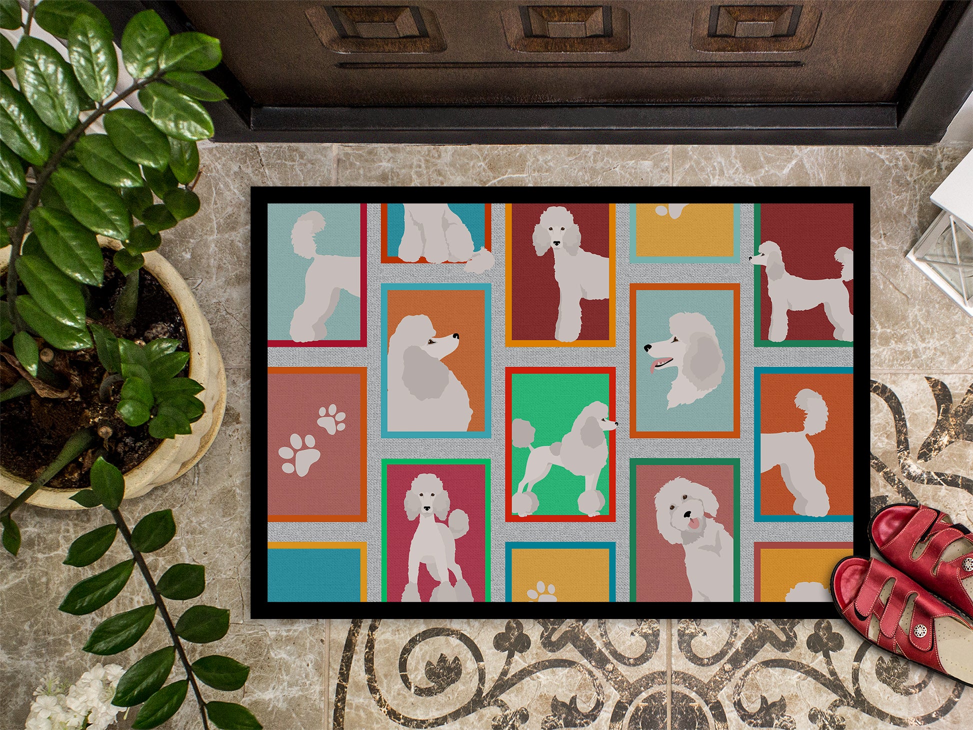 Doormat featuring breed specific Poodle artwork. Welcome your guests in style with our Artwork Door Mat, designed to withstand almost any weather condition. This mat, measuring approximately 18 by 27 inches, is held together by durable black binding tape. Its top layer, composed of polyester felt, is dyed with the eye-catching image you see on the mat. A few layers below provide the mat with stability, while its rubber bottom is stamped to help prevent slipping and ensures safety. Our mat works wonderfully as both an indoor or outdoor door mat. For cleaning, simply hose it off with water or use a power washer - no need for any cleaner that produces suds. Avoid scrubbing with a brush, instead, opt for the vacuum on floor setting. Designed manufactured and printed in the USA, this mat is a perfect addition to your porch, outdoor kitchen, entryway, or any indoor space. Its unique design makes it a charming decorative rug that greets your guests and adds a stylish touch to your home decor.