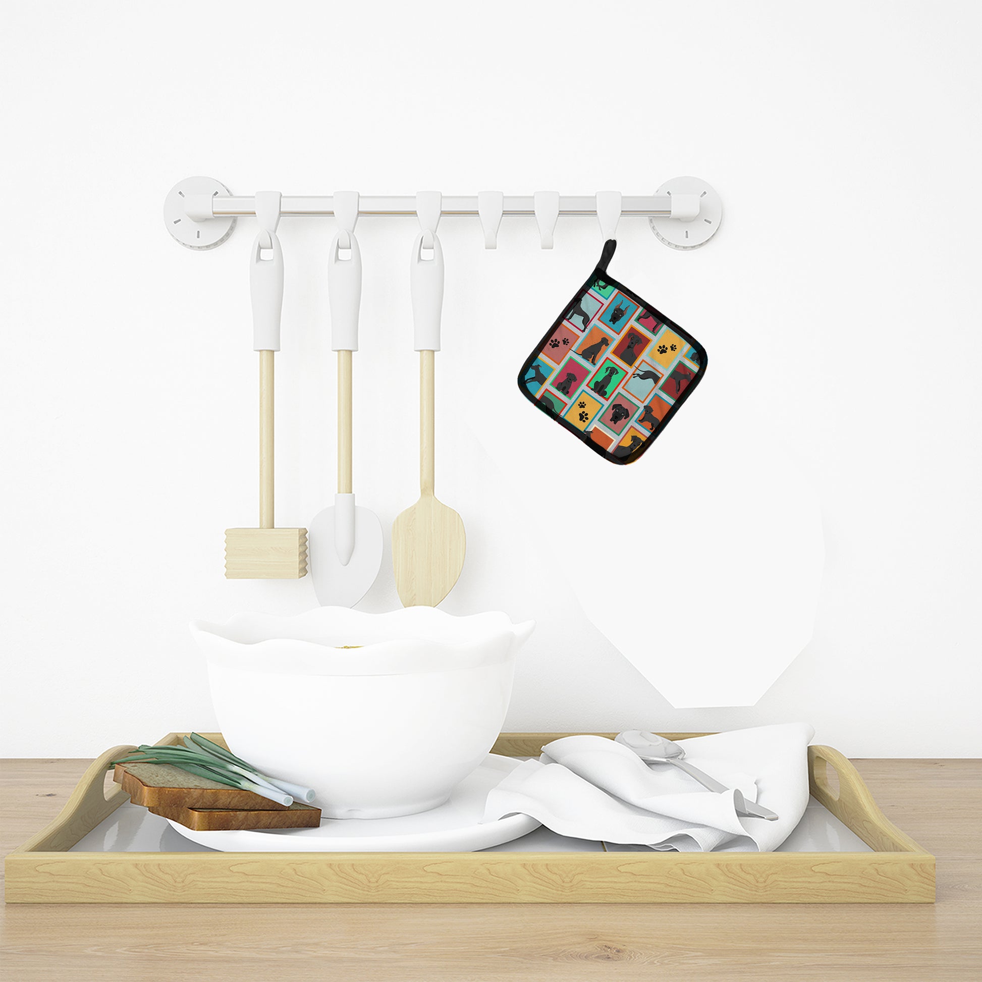 Pair of Pot Holders featuring breed specific Great Dane artwork. A Pair of Pot Holders to match your kitchen decor. Made in the USA these are thick and functional. Full color artwork decorates the front polyester fabric of the hot pad and accented by a black trim. Use these at as a trivet for your Thanksgiving or Christmas tablescape. Filled with insulated fabric and quilted for durability. These colorful pot holders will make a great gift for your favorite home cook or executive chef. Each pot holder measures approximately 7 1/2 inches by 7 1/2 inches. A hanging tab is included.