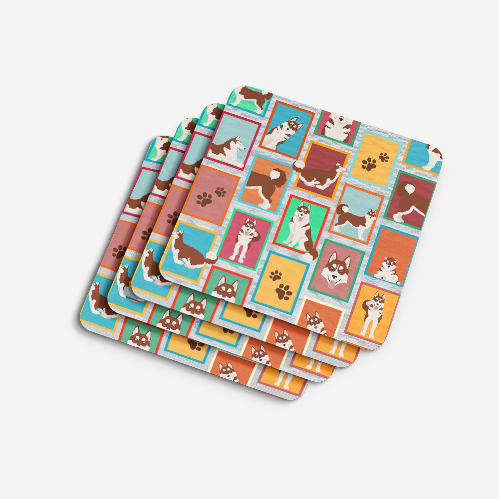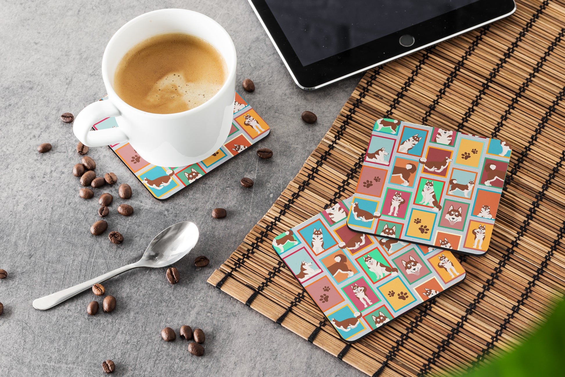 Foam Coasters featuring breed specific Siberian Husky artwork. Presenting our Set of 4 Foam Coasters, a stylish and practical addition to your table setting. Each square coaster, measuring 3 1/2 inches by 3 1/2 inches, is perfectly sized to accommodate various drinkware, from coffee mugs to tumblers. These coasters stand out with their full-color artwork, permanently dyed onto the material for a vibrant and fade-resistant finish. They're not just functional, they're a fashionable statement, adding a touch of flair to any gathering or event. Our foam coasters serve a dual purpose - they protect your table from water stains and are perfect for both hot and cold drinks. The material used is similar to that of our high-quality mouse pads, ensuring durability and heat resistance. These coasters are easy to maintain - simply wash them in the top of your dishwasher and lay flat to dry. The design won't come off, ensuring they retain their vivid colors for years. Pair them with one of our insulated coolers or huggers for a cohesive, thoughtful gift set. Enhance your beverage experience with our Set of 4 Foam Coasters.
