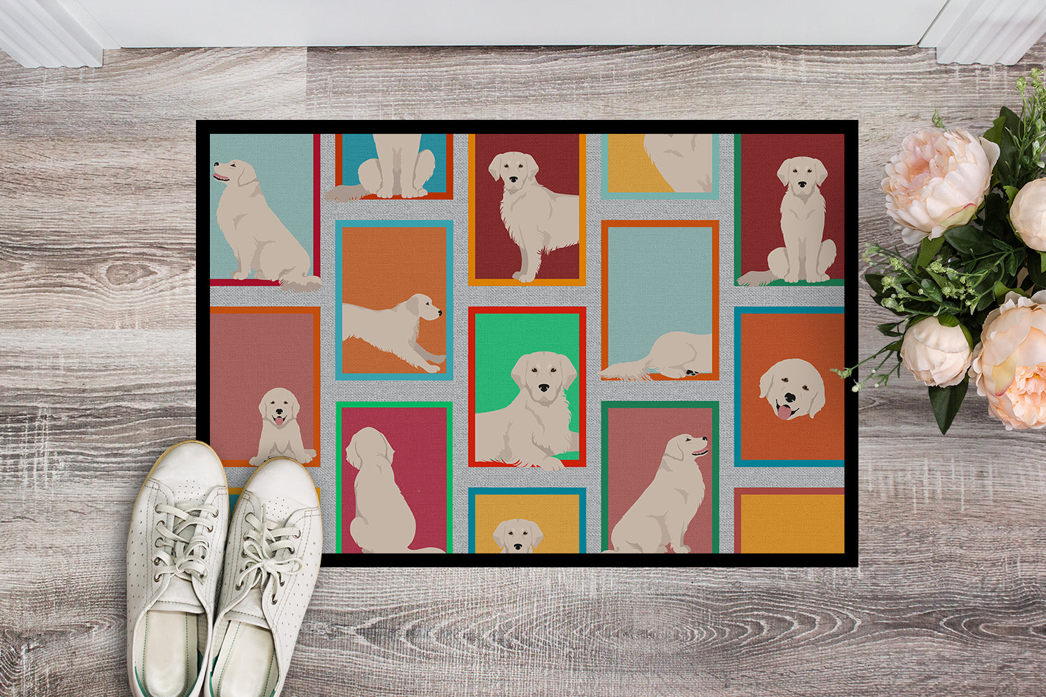 Doormat featuring breed specific Golden Retriever artwork. Welcome your guests in style with our Artwork Door Mat, designed to withstand almost any weather condition. This mat, measuring approximately 24 by 36 inches, is held together by durable black binding tape. Its top layer, composed of polyester felt, is dyed with the eye-catching image you see on the mat. A few layers below provide the mat with stability, while its rubber bottom is stamped to help prevent slipping and ensures safety. Our mat works wonderfully as both an indoor or outdoor door mat. For cleaning, simply hose it off with water or use a power washer - no need for any cleaner that produces suds. Avoid scrubbing with a brush, instead, opt for the vacuum on floor setting. Designed manufactured and printed in the USA, this mat is a perfect addition to your porch, outdoor kitchen, entryway, or any indoor space. Its unique design makes it a charming decorative rug that greets your guests and adds a stylish touch to your home decor.