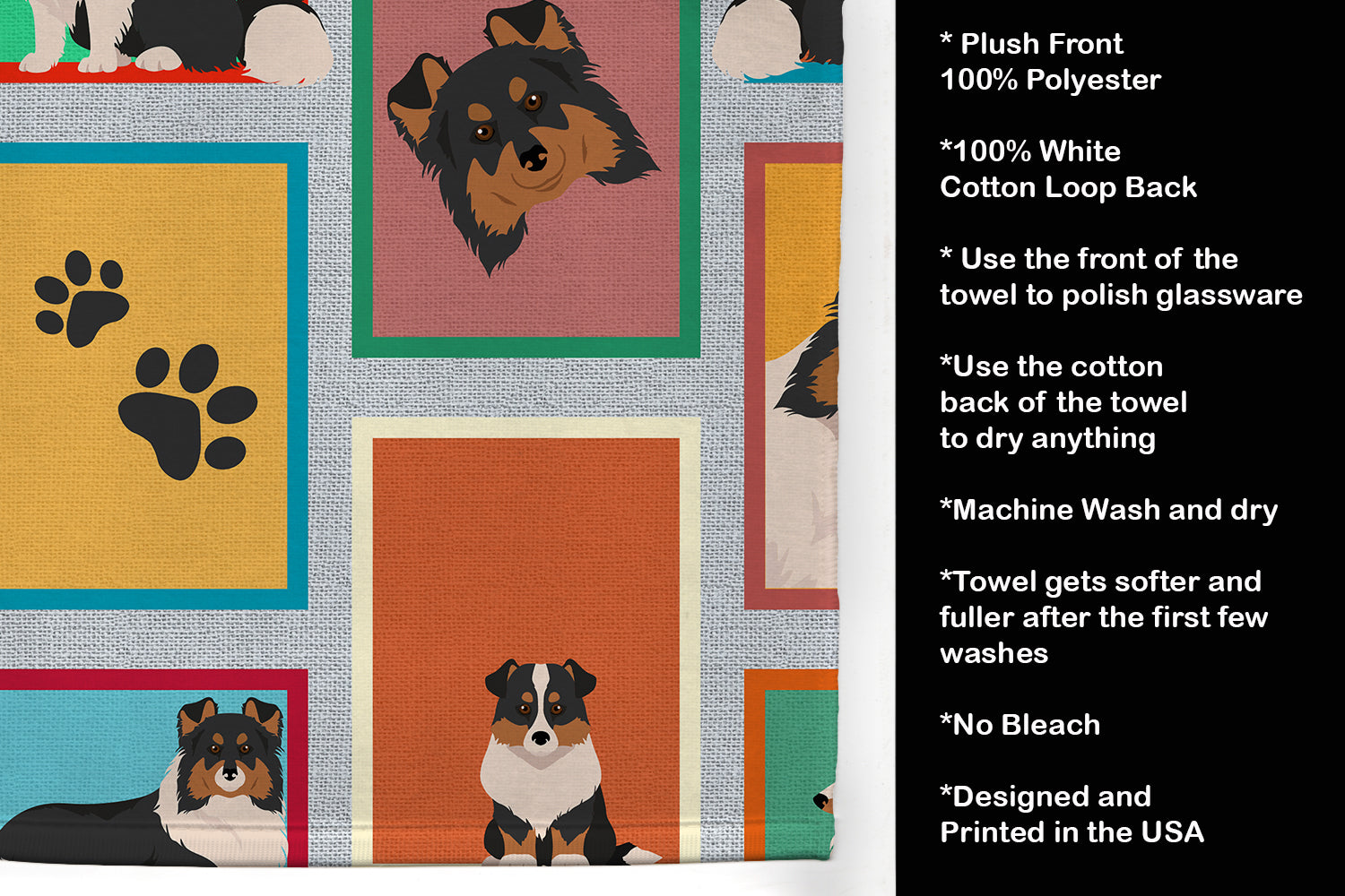 Kitchen Towel featuring breed specific Sheltie artwork. Experience the perfect blend of aesthetic appeal and functional excellence with our Plush Velour Kitchen Towels. These are not your ordinary decorative kitchen towels that gather dust. Instead, they are designed to be as practical as they are stylish. The front layer of our towel is constructed from a minky plush polyester, known for its durability and color retention. Unlike conventional kitchen towels, the artwork on our towels is dyed directly into the fabric, ensuring vibrant colors that last. Polish your glassware to a brilliant sparkle using the plush front side of the towel. Flip to the back, crafted from 100% cotton terry loop, to exploit its exceptional absorbency for drying dishes or wiping down counters. Our kitchen towels redefine the concept of functional art, offering lasting quality that maintains the towel's shape over time. Measuring 15 inches by 25 inches and weighing 2.3 lbs per dozen, these towels deliver an overwhelming sensory experience with their soft, plush, and smooth texture. The edges are meticulously finished with binding, enhancing their durability and visual appeal. For your convenience, these towels are machine washable and can be dried on low heat. After the first wash, the top fabric becomes even softer and fluffier, eliminating the need for ironing. Treat your kitchen to the luxury and functionality it deserves with our plush velour kitchen towels.
