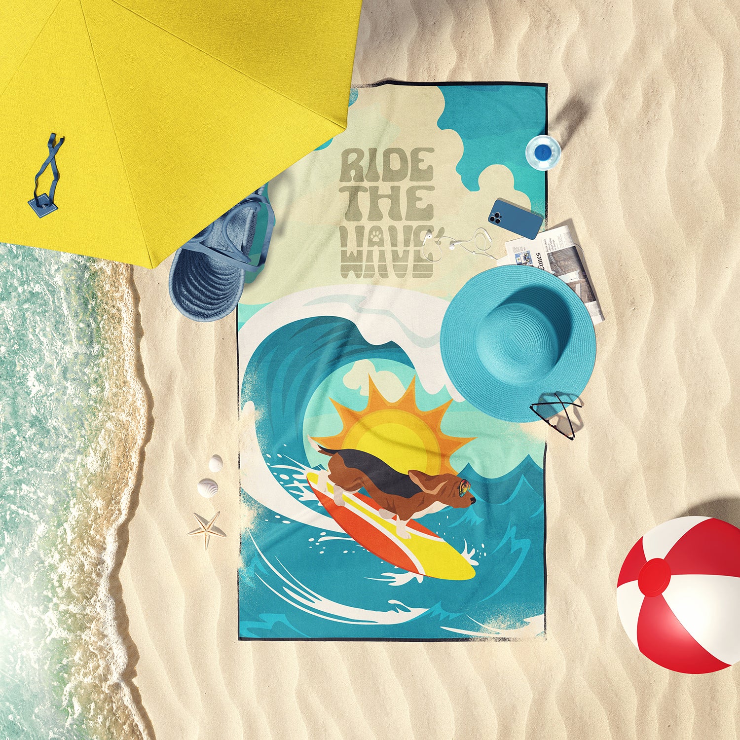 Surfer Dog Tricolor Basset Hound Premium Beach Towel