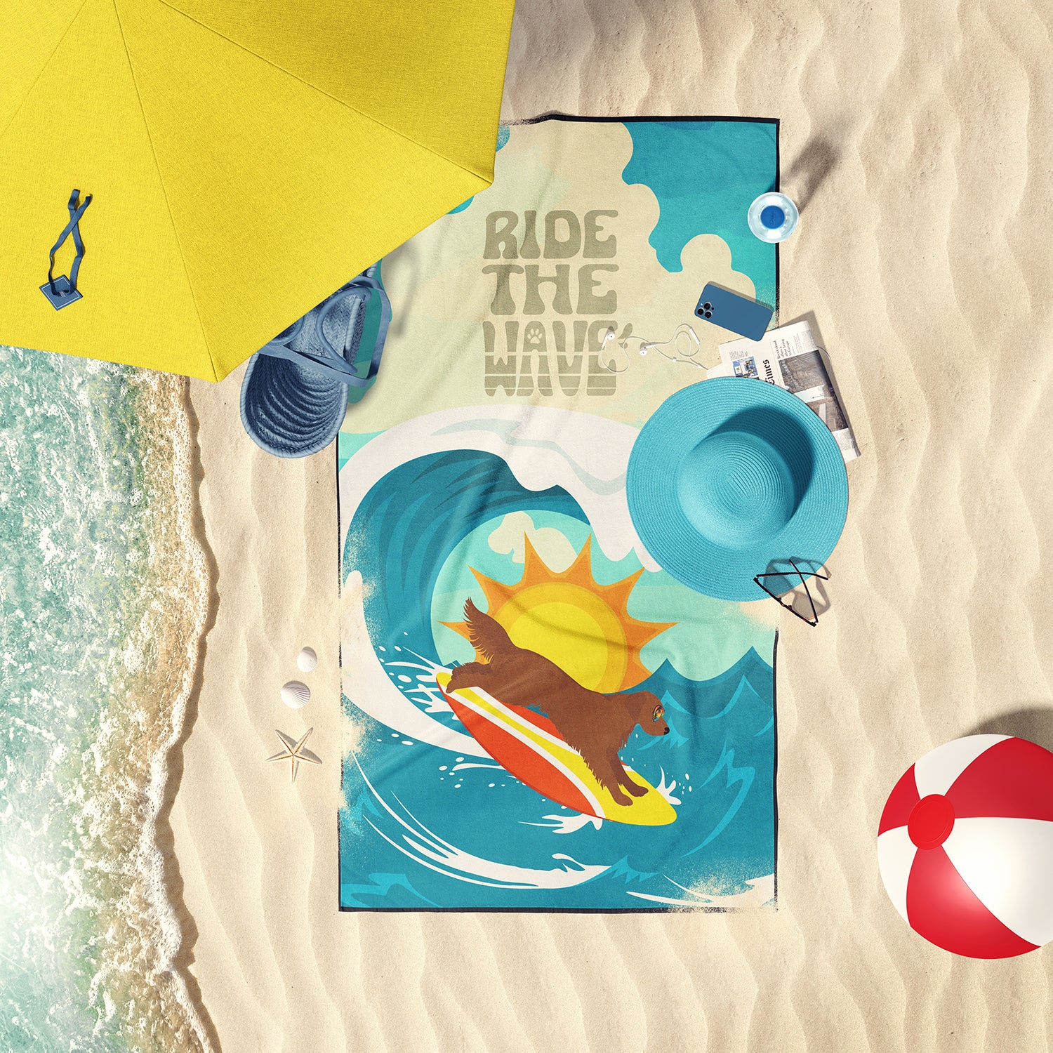 Surfer Dog Mahogany Golden Retriever Premium Beach Towel